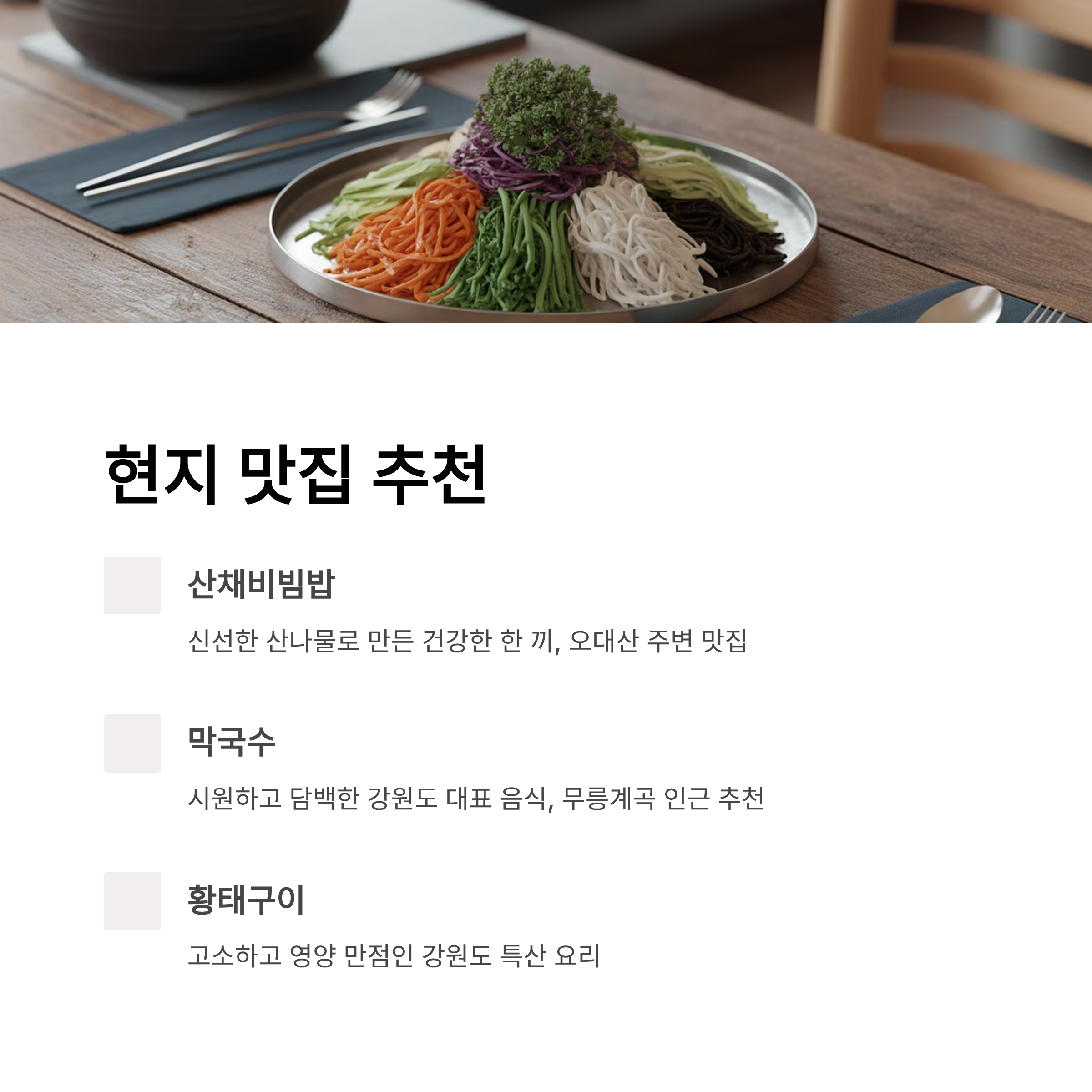 | 현지 맛집 | (오대산) 산채비빔밥, 황태요리 (동해) 해산물, 곰치국, 막국수 (원주) 메밀 막국수, 한우 |