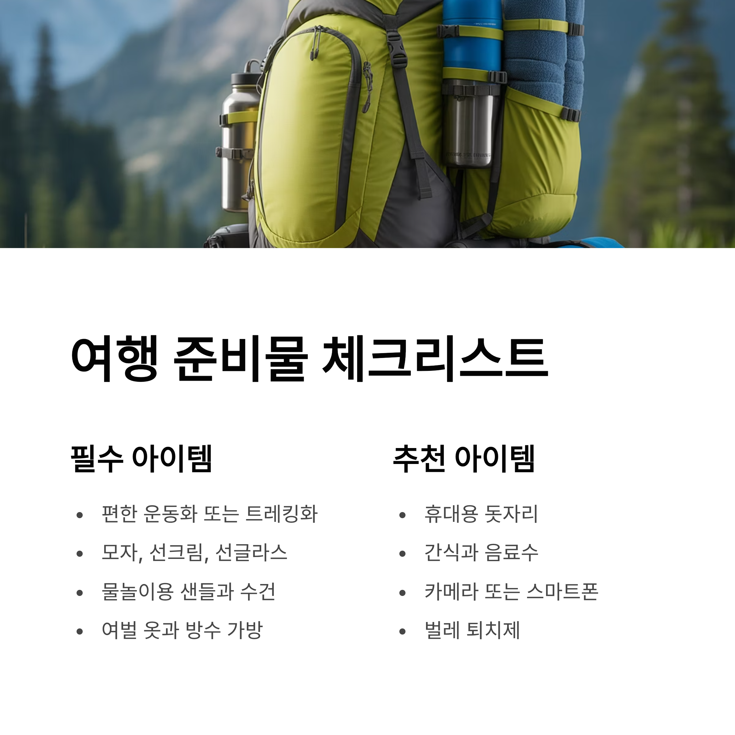 | 준비물 | 계절 의류/편한 신발, 개인 위생용품, 선크림, 벌레 퇴치제, 상비약, 충전기, 작은 백팩, 우산/우비 | 꼼꼼한 체크리스트로 빠짐없이 준비, 계절별 맞춤 물품 확인 |