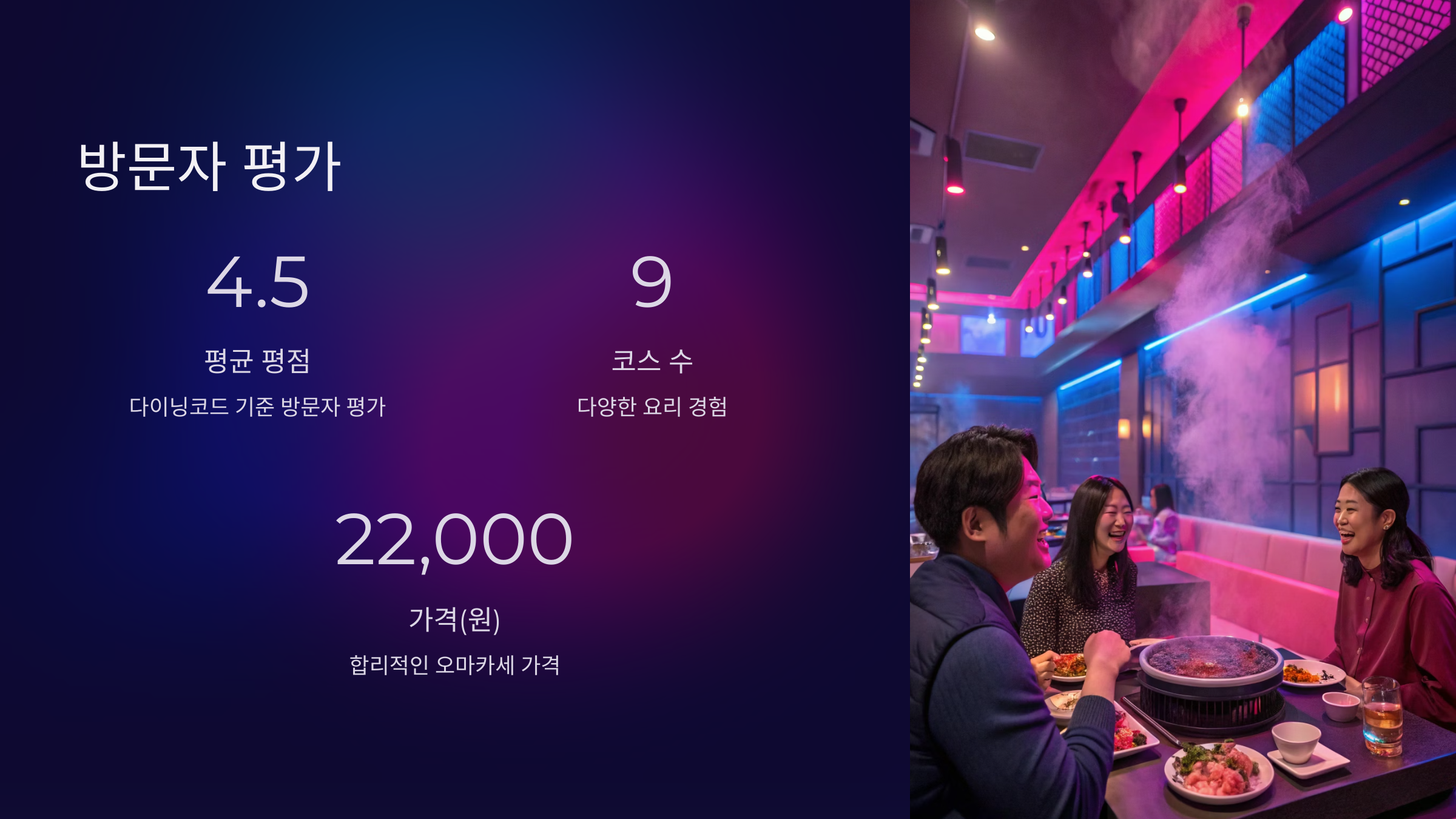 - 가격: "오마카세로 이 정도의 다양성과 품질은 대단하다."