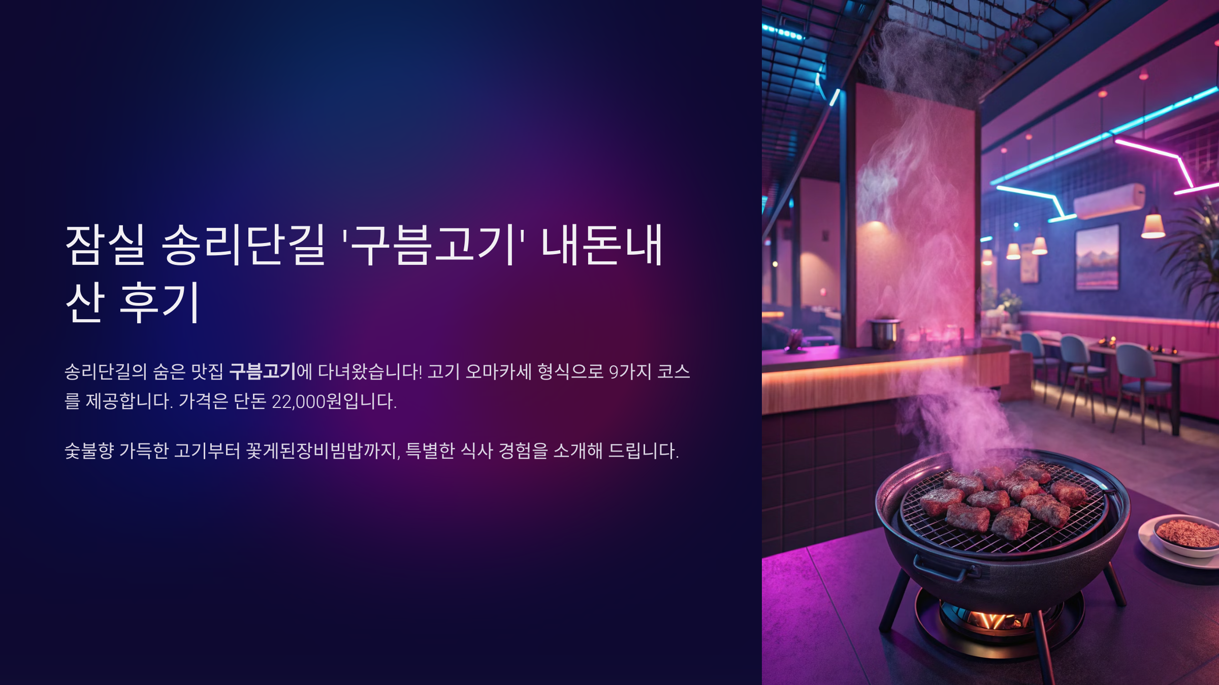 송리단길의 숨은 맛집으로 소문난 '구븜고기'에 다녀왔습니다! 고기 오마카세 형식으로 총 9가지 코스를 제공하며 가격은 단돈 22,000원. 요즘 고급 식사의 트렌드인 오마카세를 이렇게 합리적인 금액에 경험할 수 있다니 놀랍지 않나요? 이번 리뷰에서는 메뉴 구성, 맛, 분위기, 예약 팁 등을 직접 경험을 바탕으로 자세히 알려드릴게요.