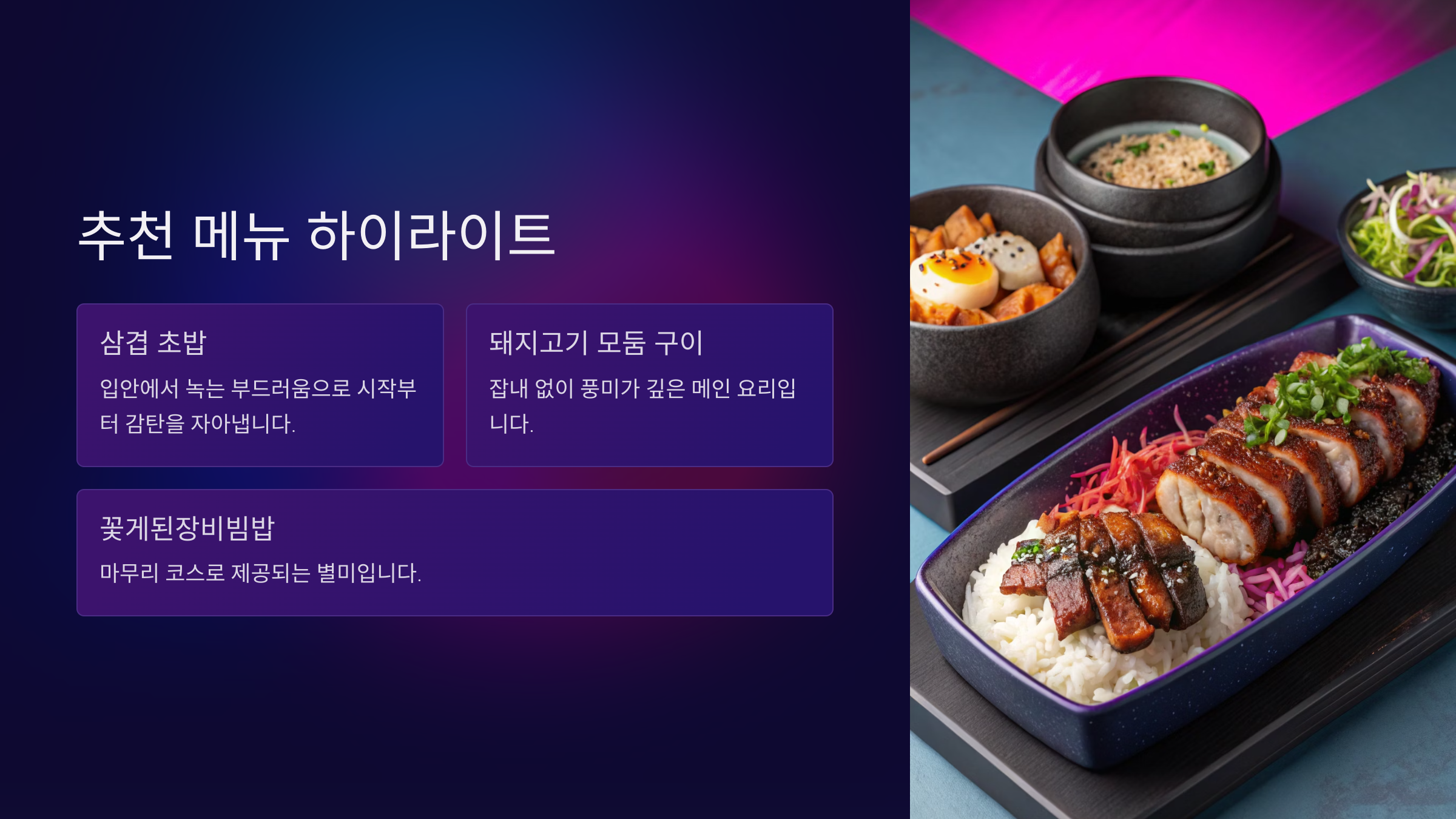 코스는 애피타이저부터 디저트까지 가득 채워졌습니다. 특히 삼겹 초밥은 입안에서 녹는 부드러움으로 시작부터 감탄을 자아냈고, 메인 요리인 돼지고기 모둠 구이는 잡내 없이 풍미가 깊었습니다. 꽃게된장비빔밥으로 마무리되는 밥은 따로 주문 가능한 별미로 손색이 없었어요.