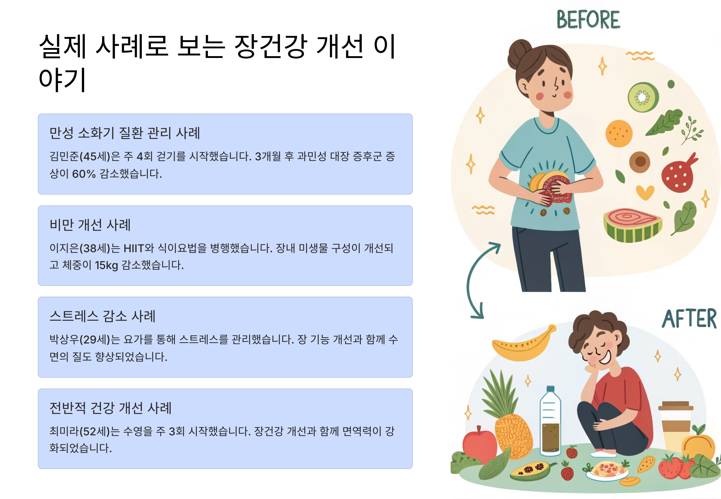 운동이 장 건강에 얼마나 효과적인지는 실제 사람들의 사례를 보면 더 확실히 느껴져요. 과민성 대장 증후군, 만성 변비, 복부 팽만감 등으로 고생하던 분들이 운동을 통해 증상이 호전된 이야기는 정말 많거든요. 자, 현실 속 이야기로 들어가볼게요!