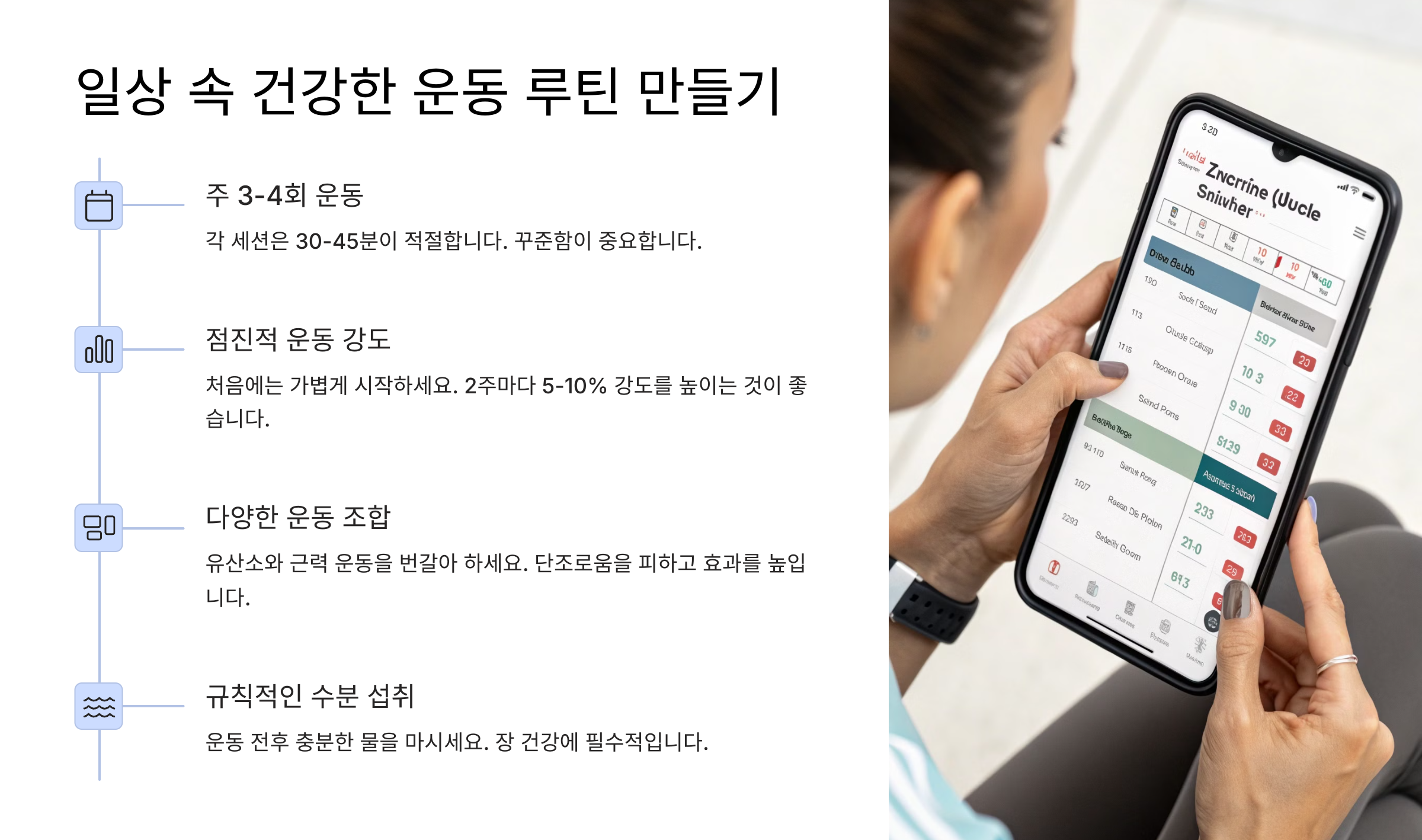 운동 루틴은 하루 중 가장 여유 있는 시간대를 선택해서 만들어보세요. 어떤 사람은 아침에 집중이 잘 되고, 또 어떤 사람은 저녁이 더 효율적이거든요. 중요한 건 '지금 당장 시작할 수 있는가?'예요. 부담 없이 꾸준히 할 수 있는지 기준을 잡는 게 좋아요.