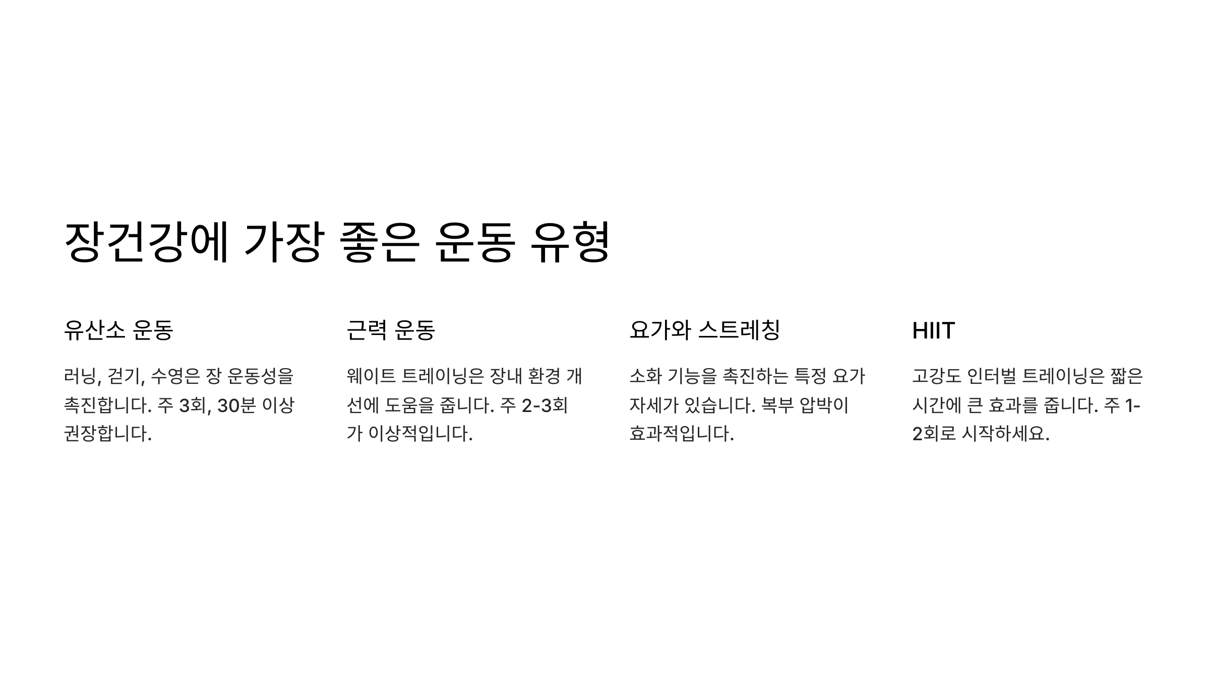 중요한 건 ‘나에게 맞는 운동’을 찾는 거예요. 무리한 운동보다 즐겁고 꾸준히 할 수 있는 운동을 선택하는 게 장 건강에 있어 핵심이랍니다. 습관으로 만들 수 있는 간단한 운동부터 차근차근 시작해보는 걸 추천해요!