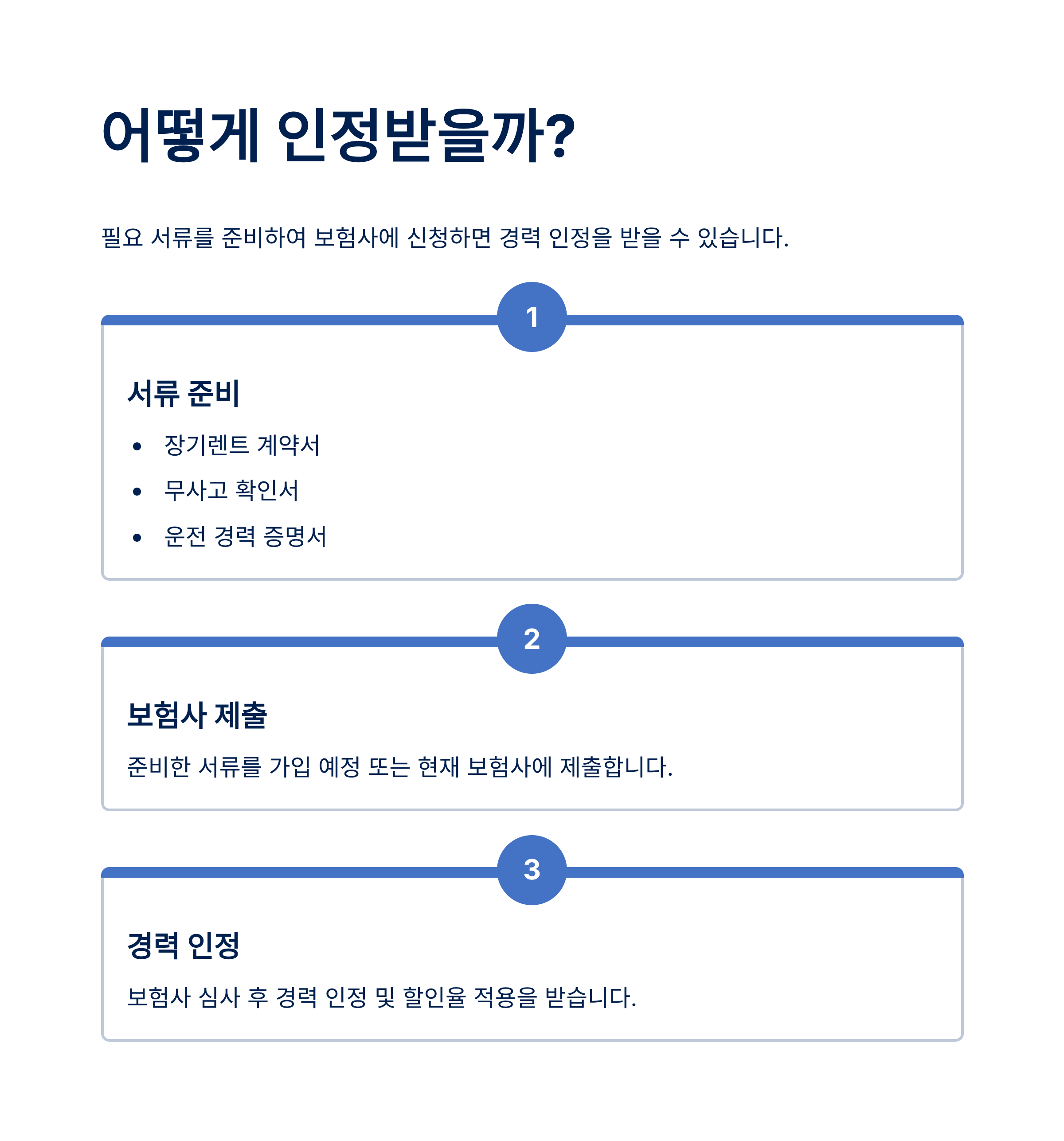 - 장기렌터카 계약자(운전자)가 렌터카 회사를 통해 '렌터카 차량운전 경력증명서'를 발급받아 보험사에 제출하면, 해당 운전 기간을 보험 가입 경력으로 인정받을 수 있습니다.