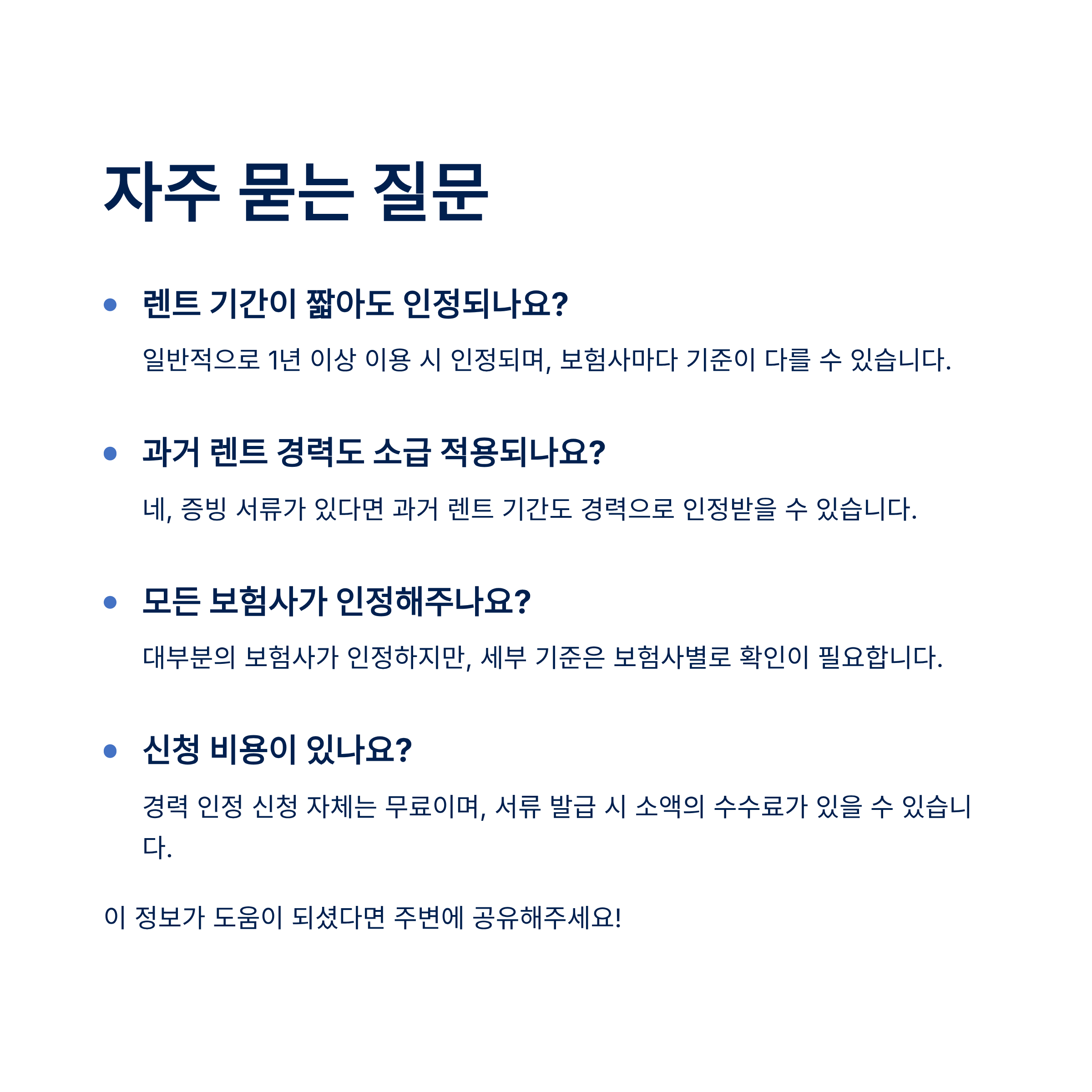 - 업무용으로 장기렌트를 이용했거나, 법인 명의 장기렌트 차량의 운전자로 지정되어 운행했던 경우에도 해당 경력을 증명하여 개인 보험 가입 시 혜택을 볼 수 있습니다. (렌터카 계약 형태 및 운전자 등록 여부 확인 필요)