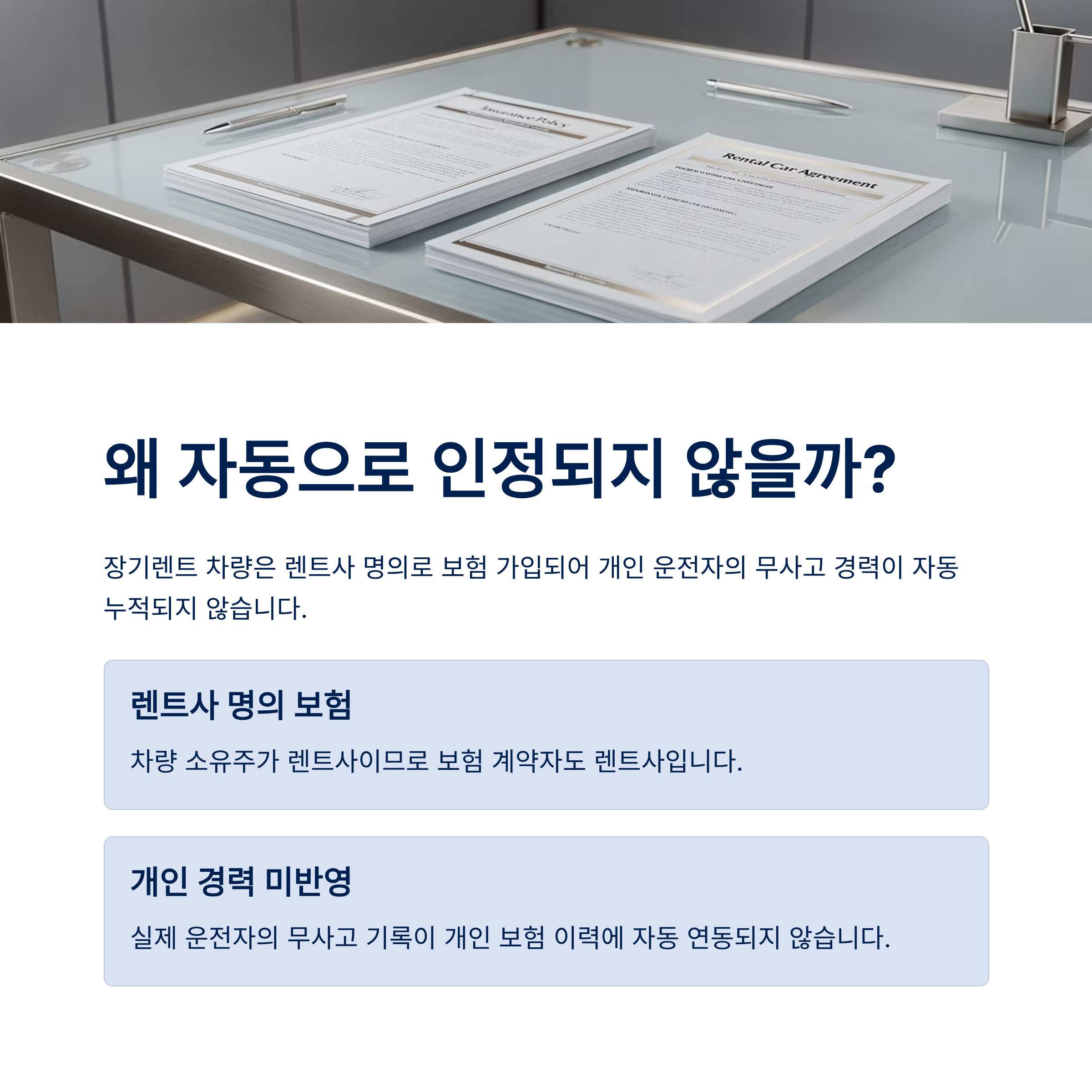 💡 1. 왜 자동으로 인정되지 않을까? (장기렌트 보험의 구조)