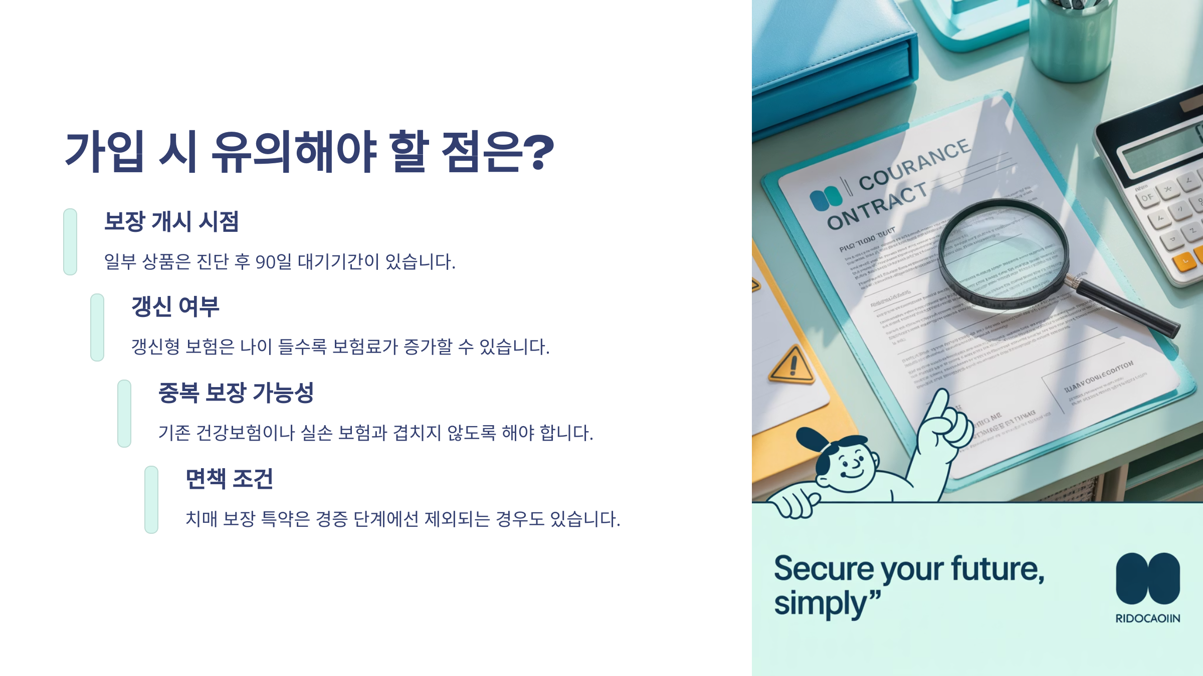 넷째, 면책 조건. 치매 보장 특약은 경증 단계에선 제외되는 경우도 있으니 약관을 꼼꼼히 살펴보세요.