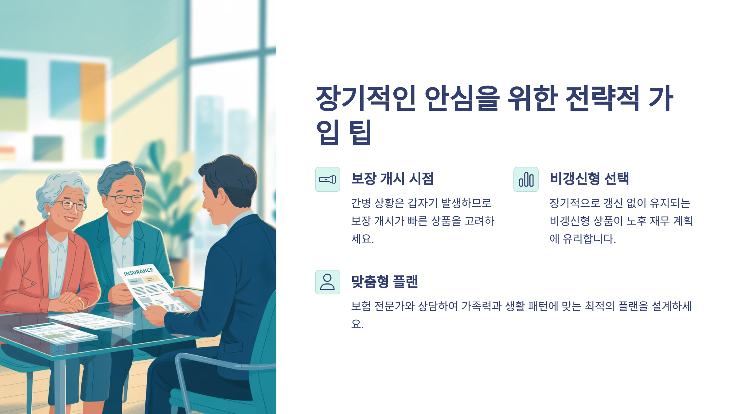 또한, 장기적으로 갱신 없이 유지되는 비갱신형 상품은 노후 재무 계획에 유리합니다.