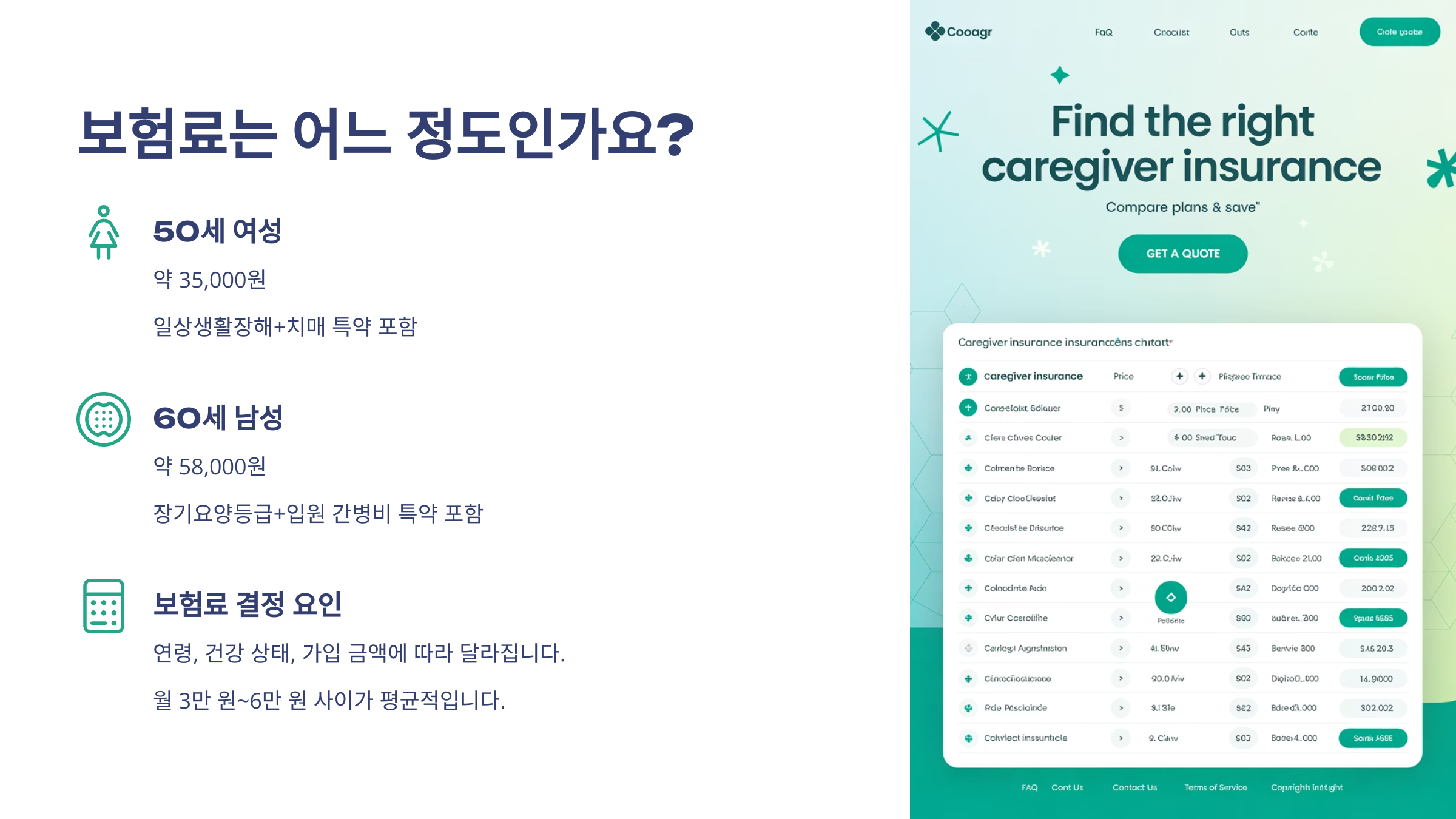 | 60세 남성 | 약 58,000원 | 장기요양등급+입원 간병비 특약 포함 |