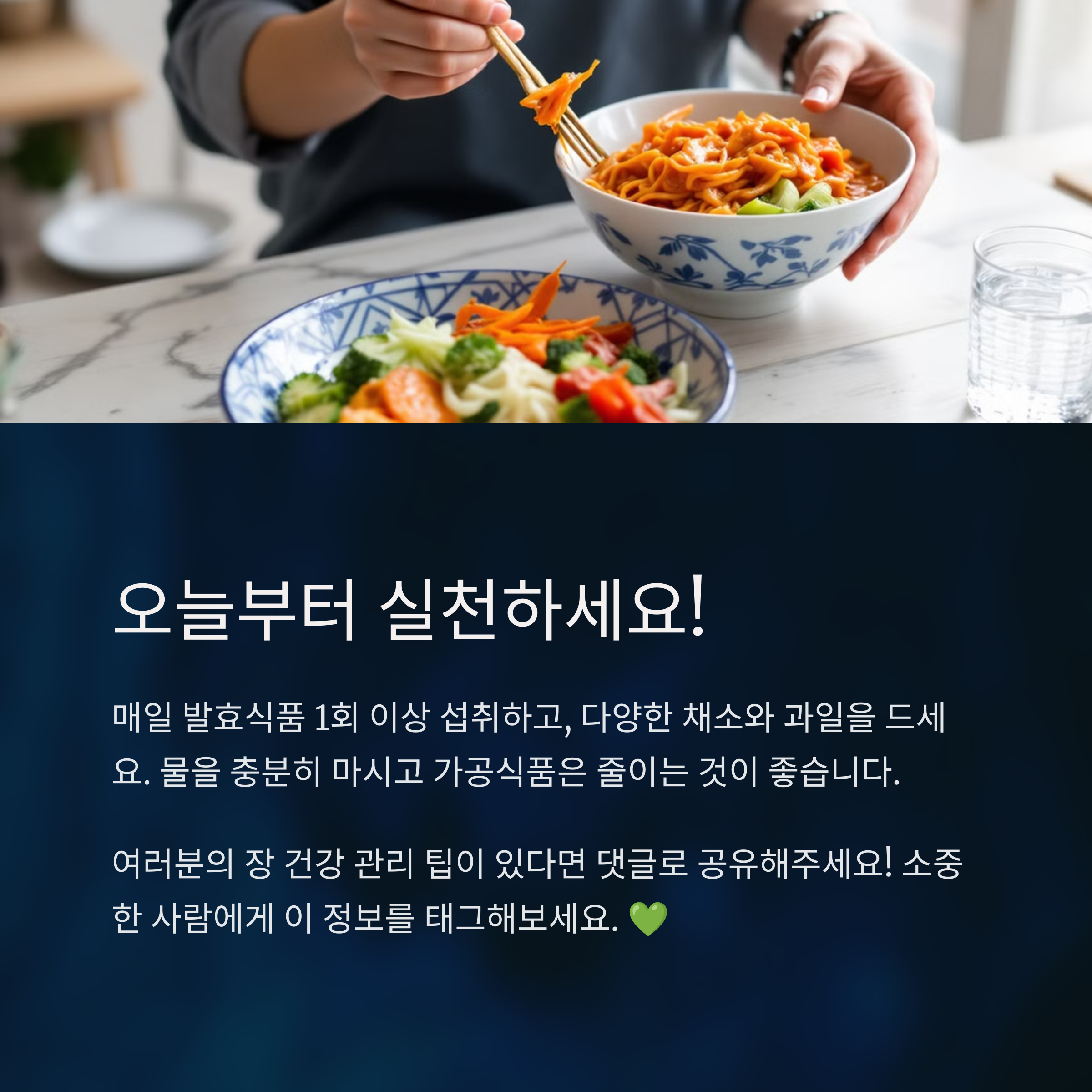 장내 유익균은 우리 건강의 기초를 이루는 중요한 요소입니다. 오늘 소개한 발효식품, 식이섬유가 풍부한 채소와 과일을 꾸준히 식단에 포함시킨다면, 면역력 증가, 소화력 향상, 염증 완화 등 다양한 긍정적인 변화를 경험하실 수 있습니다. 건강은 하루아침에 이루어지지 않지만, 좋은 습관이 쌓이면 큰 결과를 만듭니다. 지금 이 순간부터 식탁 위 변화를 실천해보세요. 여러분의 장은 분명히 반응할 것입니다.
