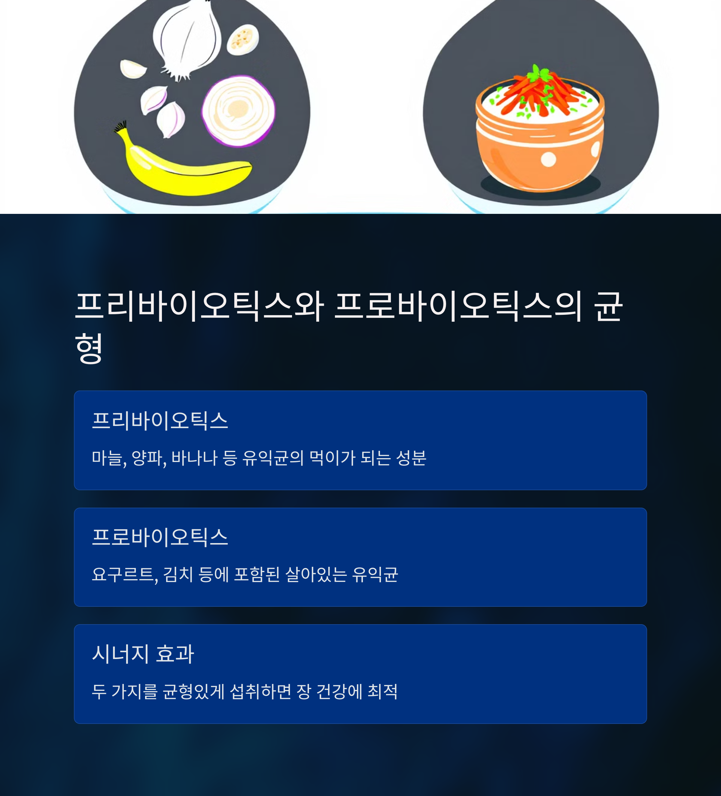 | 유산균이 풍부한 김치, 요구르트, 된장 등 | 채소, 통곡물, 과일 등에 풍부하게 포함됨 | 유익균과 유해균이 균형을 이루는 생태계 |