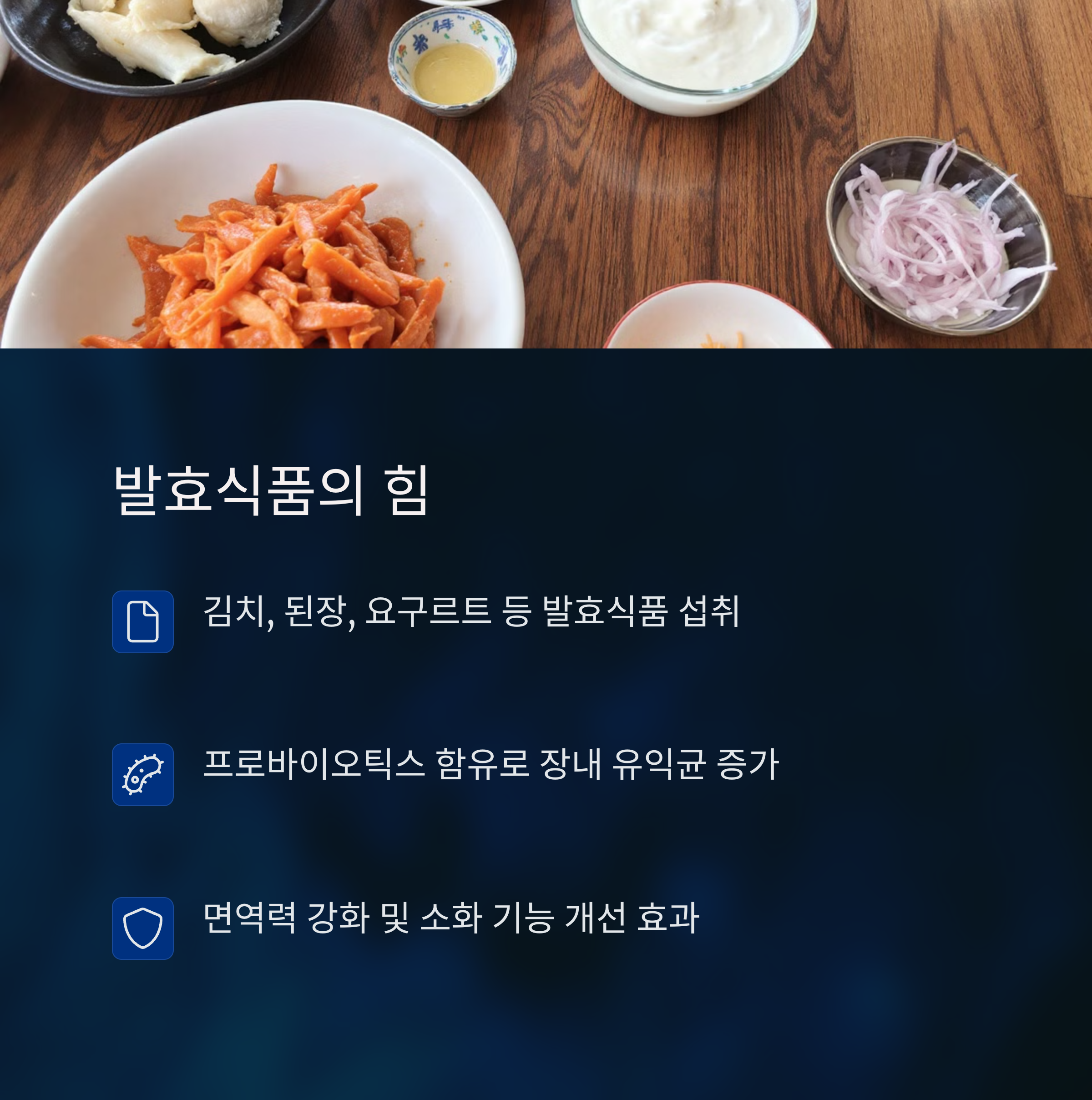유산균이 풍부한 발효식품은 장 건강을 지키는 대표적인 음식입니다. 김치, 요구르트, 된장과 같은 음식은 프로바이오틱스를 다량 함유하고 있어 장내 환경을 개선하는 데 큰 도움을 줍니다. 특히 된장과 청국장 등 전통 발효식품은 항산화 물질도 함께 들어 있어 건강을 다방면으로 지켜줍니다. 여기에 식이섬유가 풍부한 채소와 통곡물을 함께 섭취하면 유익균의 먹이가 되어 더욱 활발하게 증식할 수 있는 환경을 만들어줍니다.