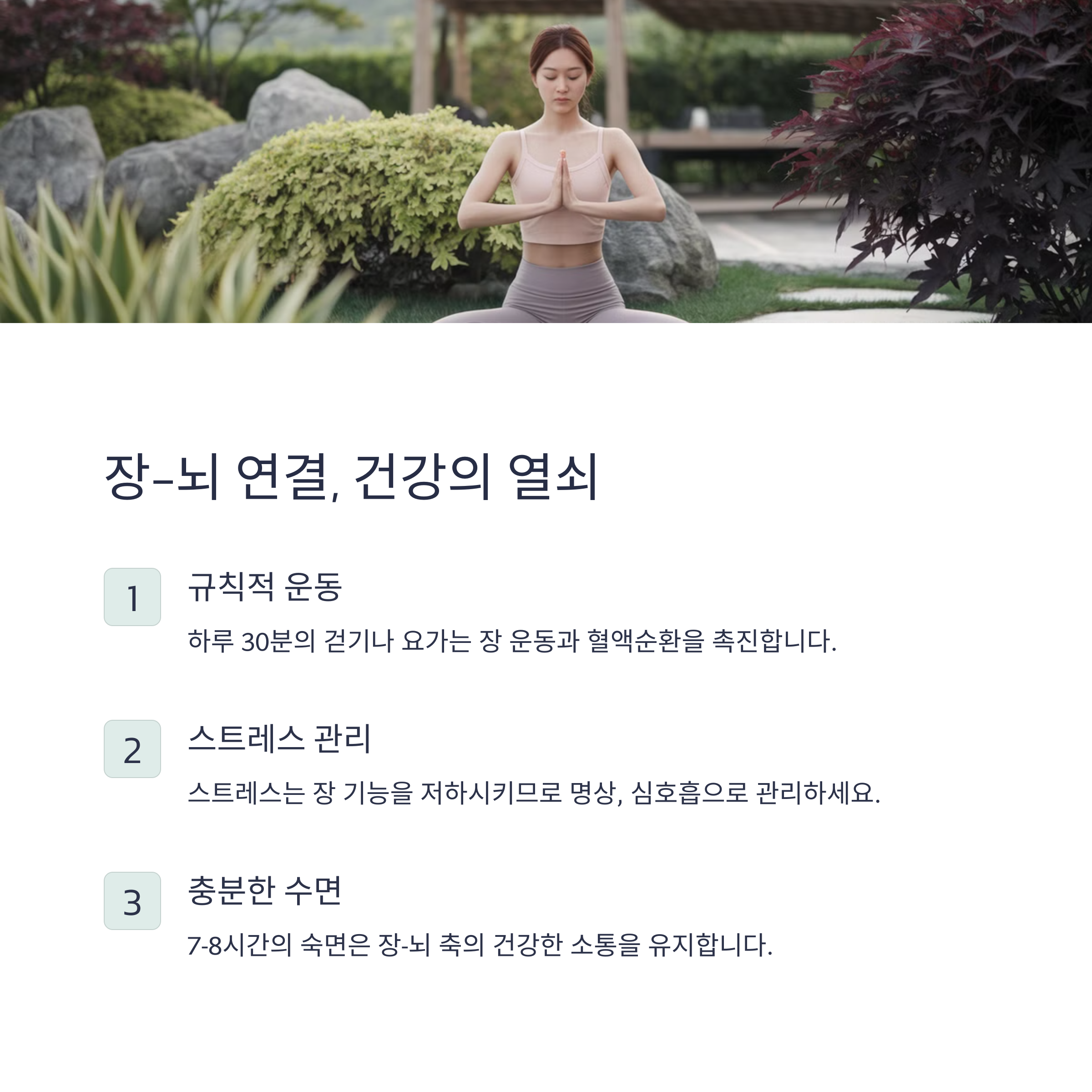 장 건강을 지키는 또 다른 방법은 스트레스 관리입니다. 장과 뇌는 서로 연결되어 있어 과도한 스트레스는 장 기능을 저하시킬 수 있습니다. 명상, 가벼운 운동, 충분한 수면을 통해 스트레스를 줄이면 장내 환경이 개선됩니다. 또한, 규칙적인 운동은 장의 연동운동을 촉진하고 소화 기능을 활성화하는 데 도움을 줍니다.