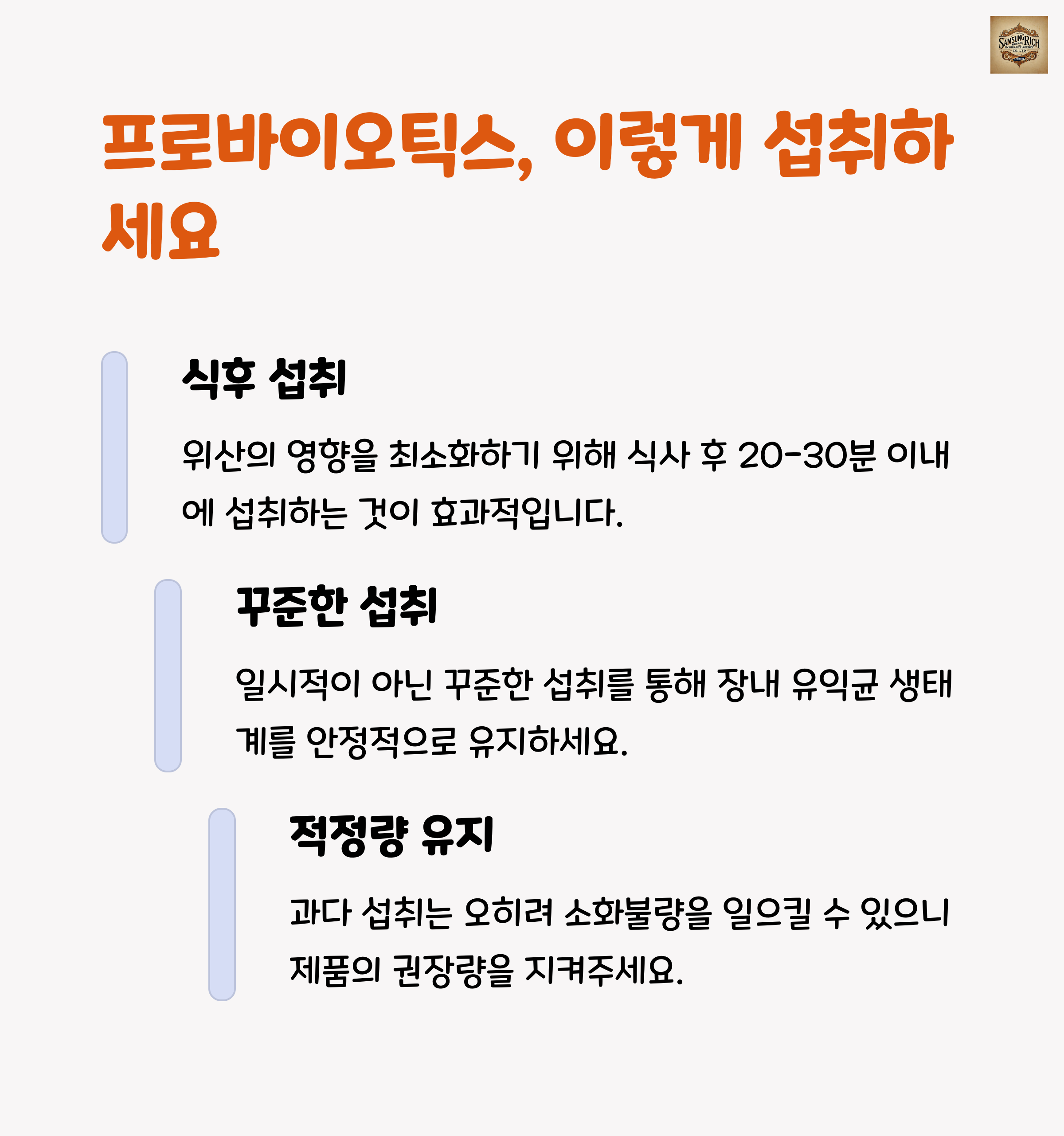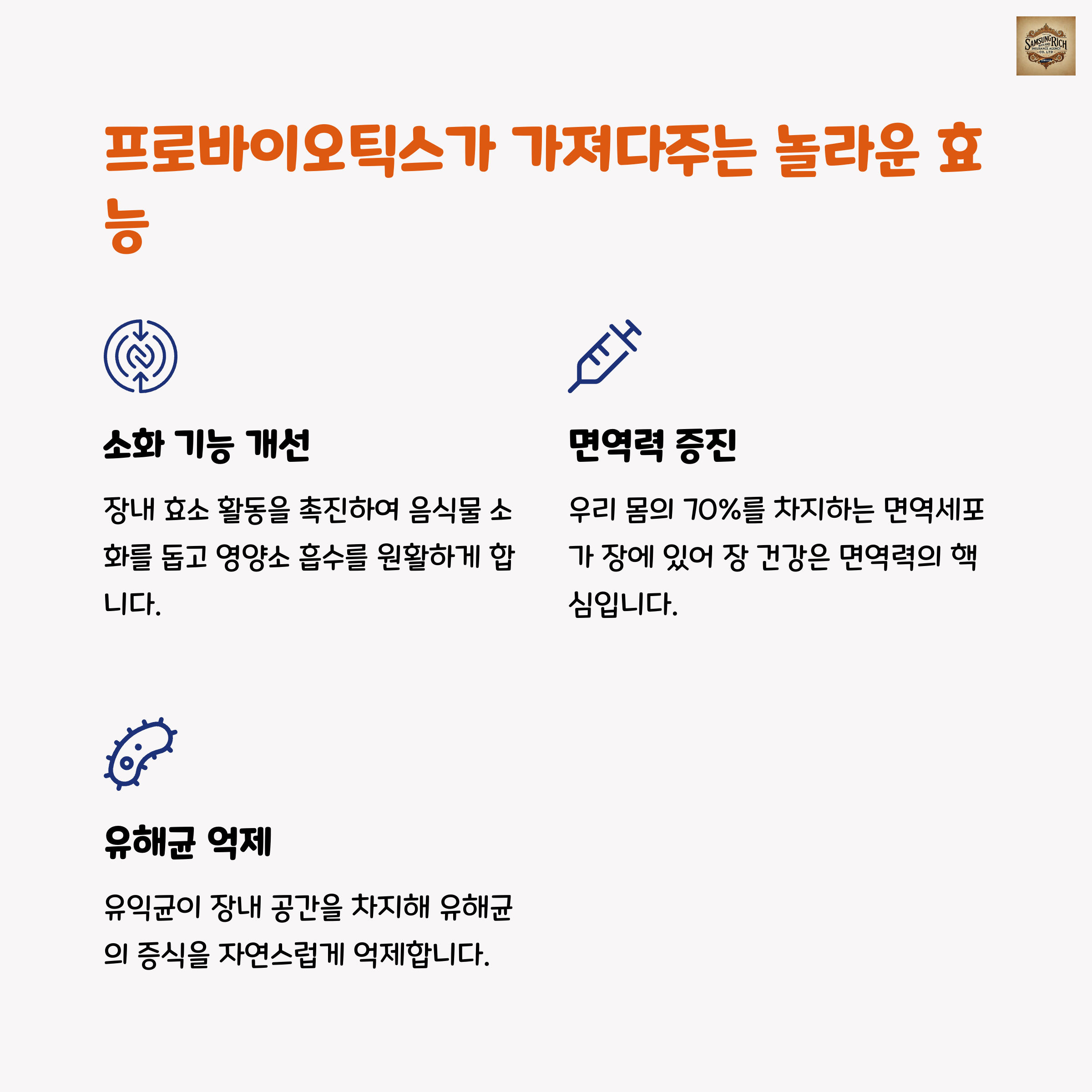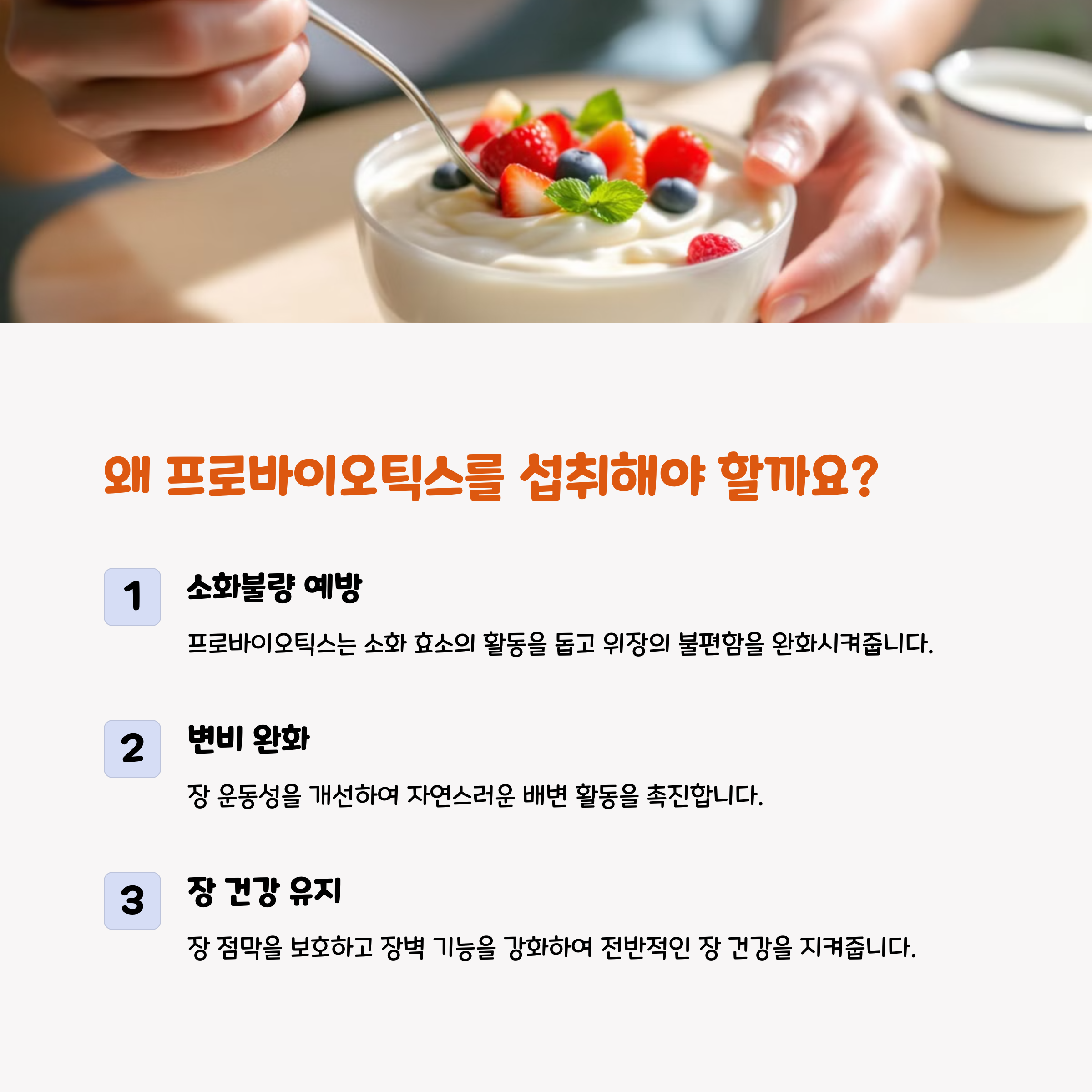 | 유익균을 통해 소화 기능을 돕습니다. | 장내 환경을 건강하게 유지합니다. | 면역 시스템을 강화하는 데 도움을 줍니다. |