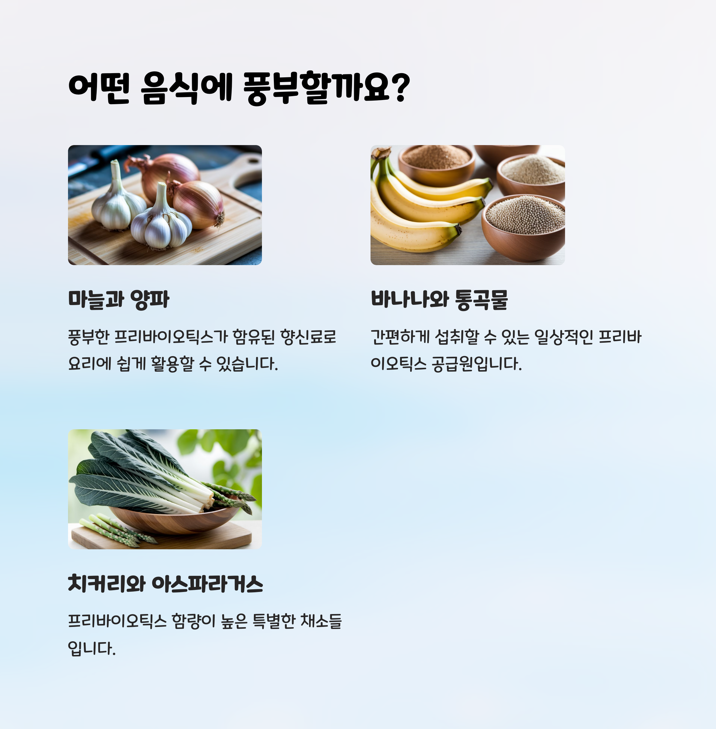 | 프리바이오틱스 역할 | 주요 음식 | 장 건강 효과 |