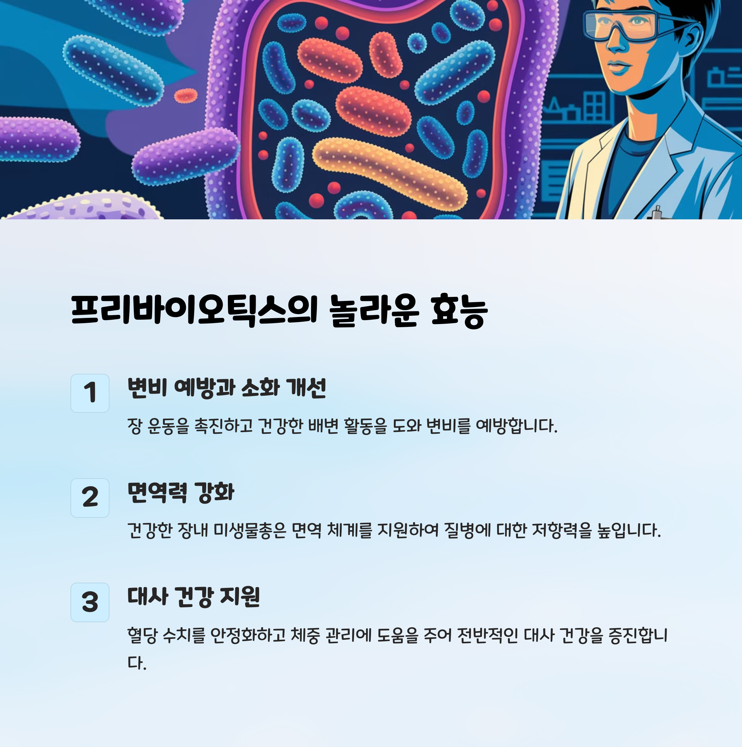 | 장내 유익균 성장 촉진 | 마늘, 양파, 바나나, 통곡물 | 소화 기능 개선, 변비 예방 |
