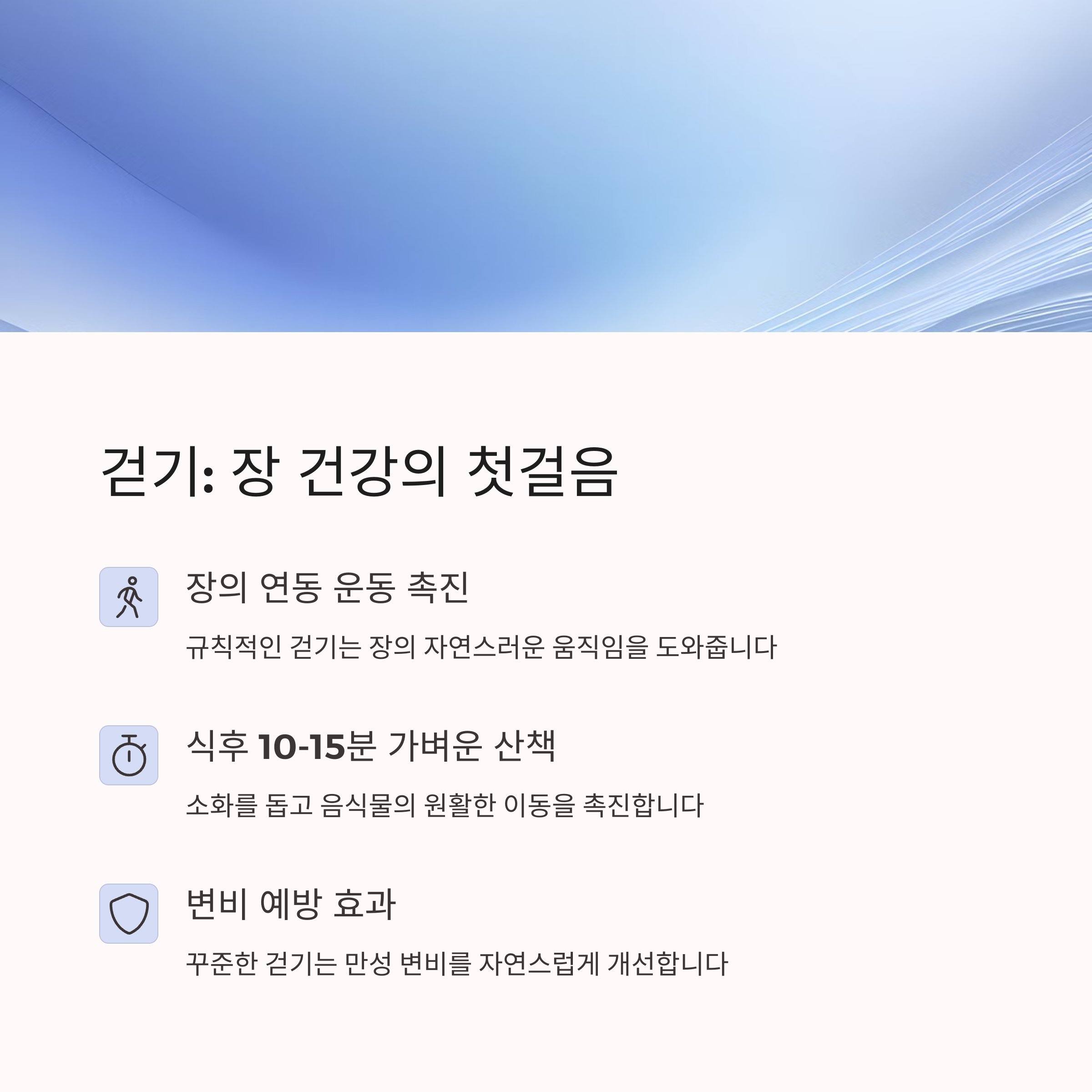 | 걷기 운동 | 장운동을 촉진하고 소화를 돕는 간단한 유산소 운동 |
