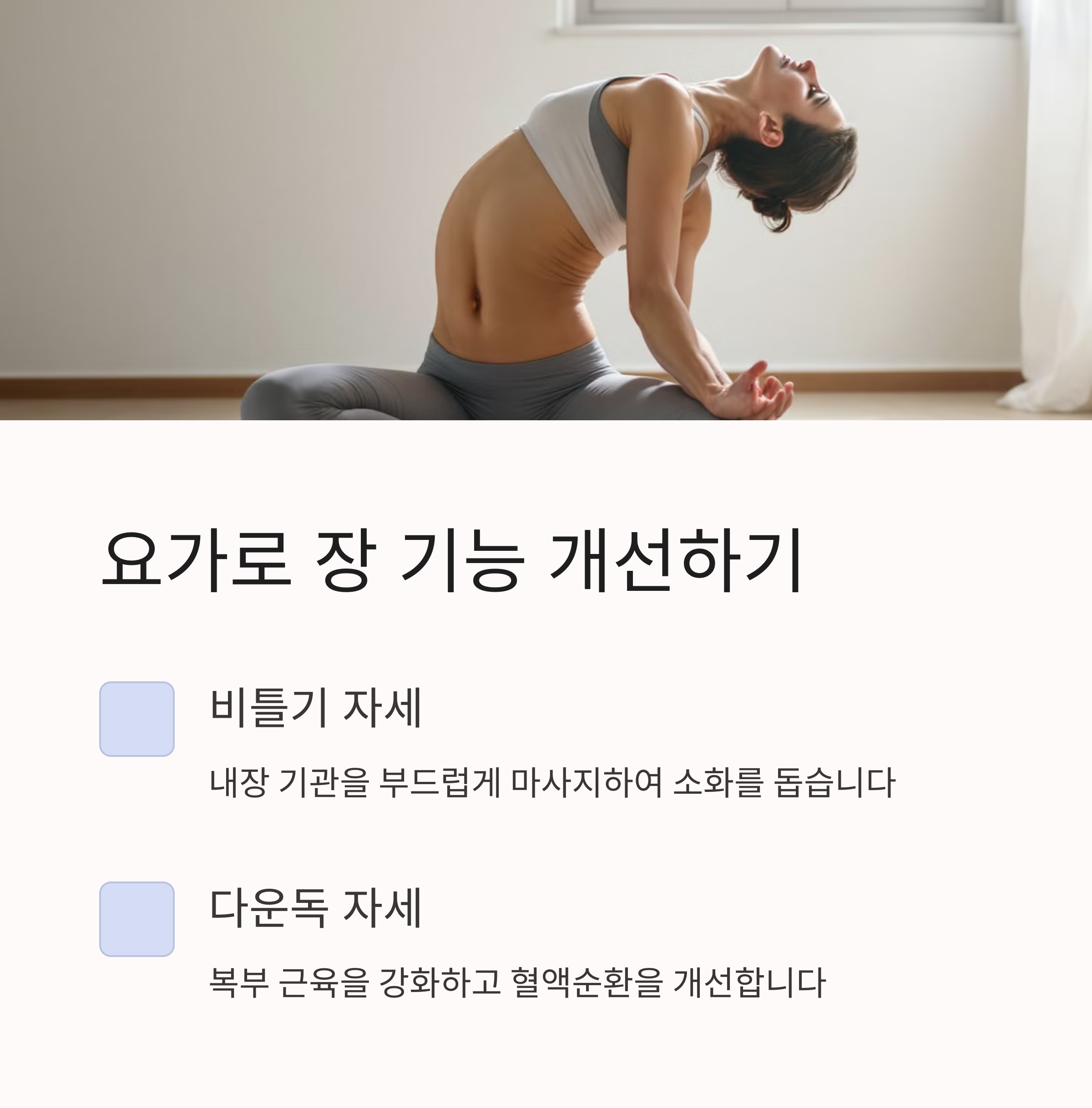 | 요가 | 장 근육을 부드럽게 자극하여 소화 개선 효과 |