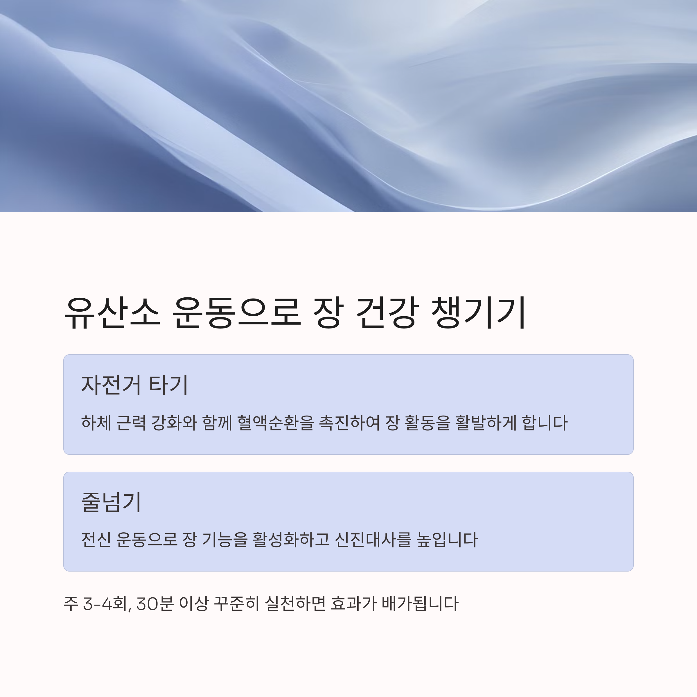 | 자전거 타기 | 혈액순환 촉진, 장 기능 활성화 | 유산소 운동 선호자 |