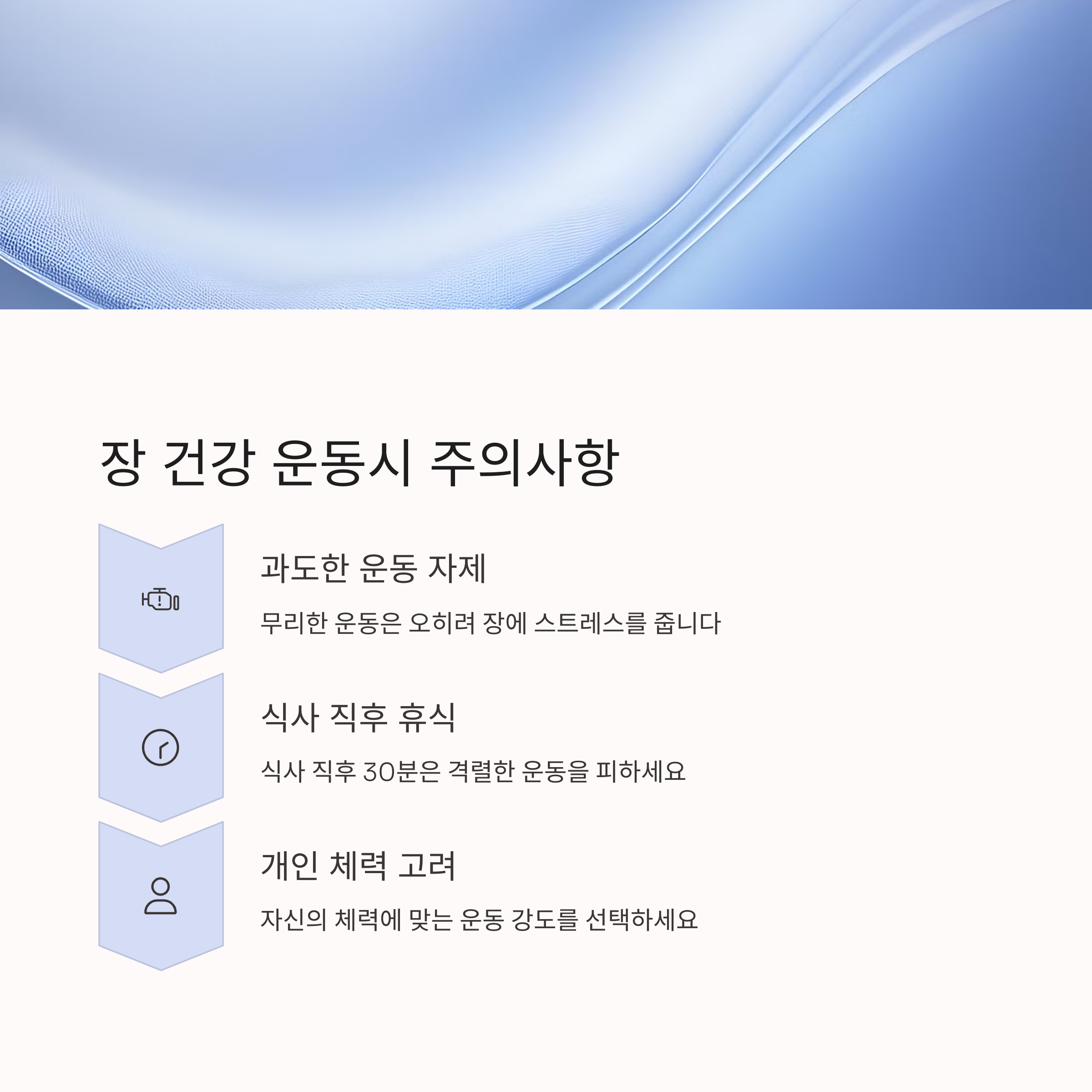 너무 격렬한 운동은 오히려 장에 부담을 줄 수 있기 때문에 처음에는 가벼운 걷기부터 시작하여 점차 강도를 높이는 것이 좋습니다.