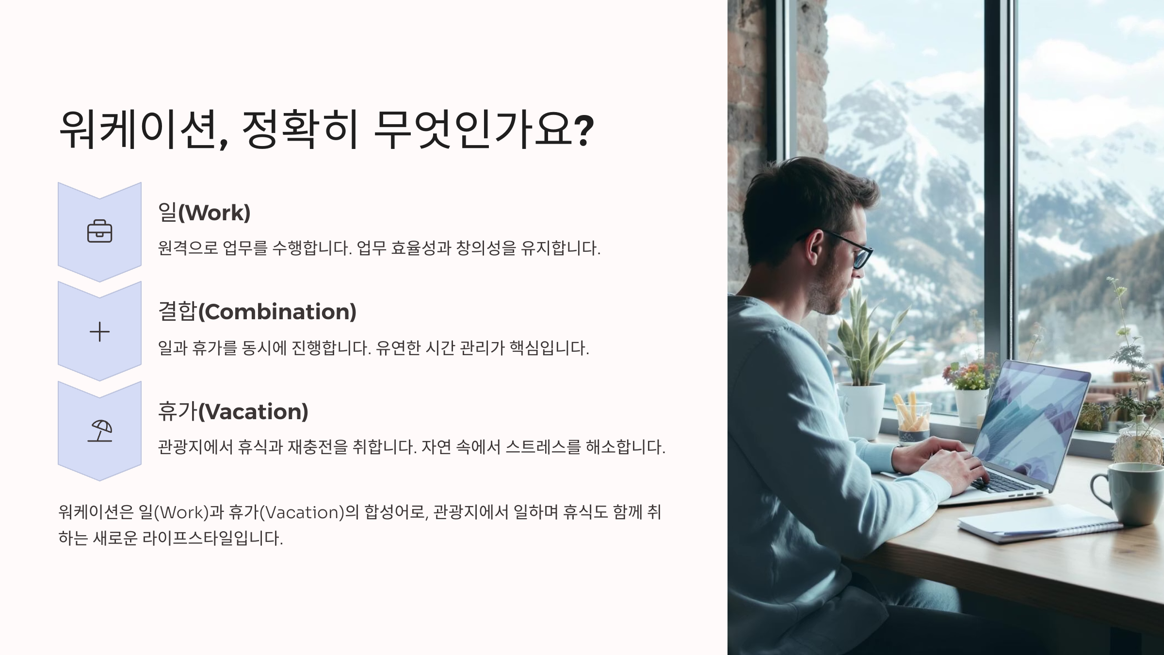 '워케이션(Workation)'은 일(Work)과 휴가(Vacation)를 결합한 신조어로, 원하는 곳에서 업무와 휴식을 동시에 즐기는 새로운 근무 형태를 의미합니다. 답답한 사무실을 벗어나 아름다운 자연이나 새로운 환경에서 일하며 창의성과 업무 효율을 높이고, 일과 후에는 바로 여가 활동을 즐길 수 있다는 장점이 있습니다. 코로나19 팬데믹 이후 원격 근무가 확산되면서 더욱 주목받고 있는 트렌드입니다.