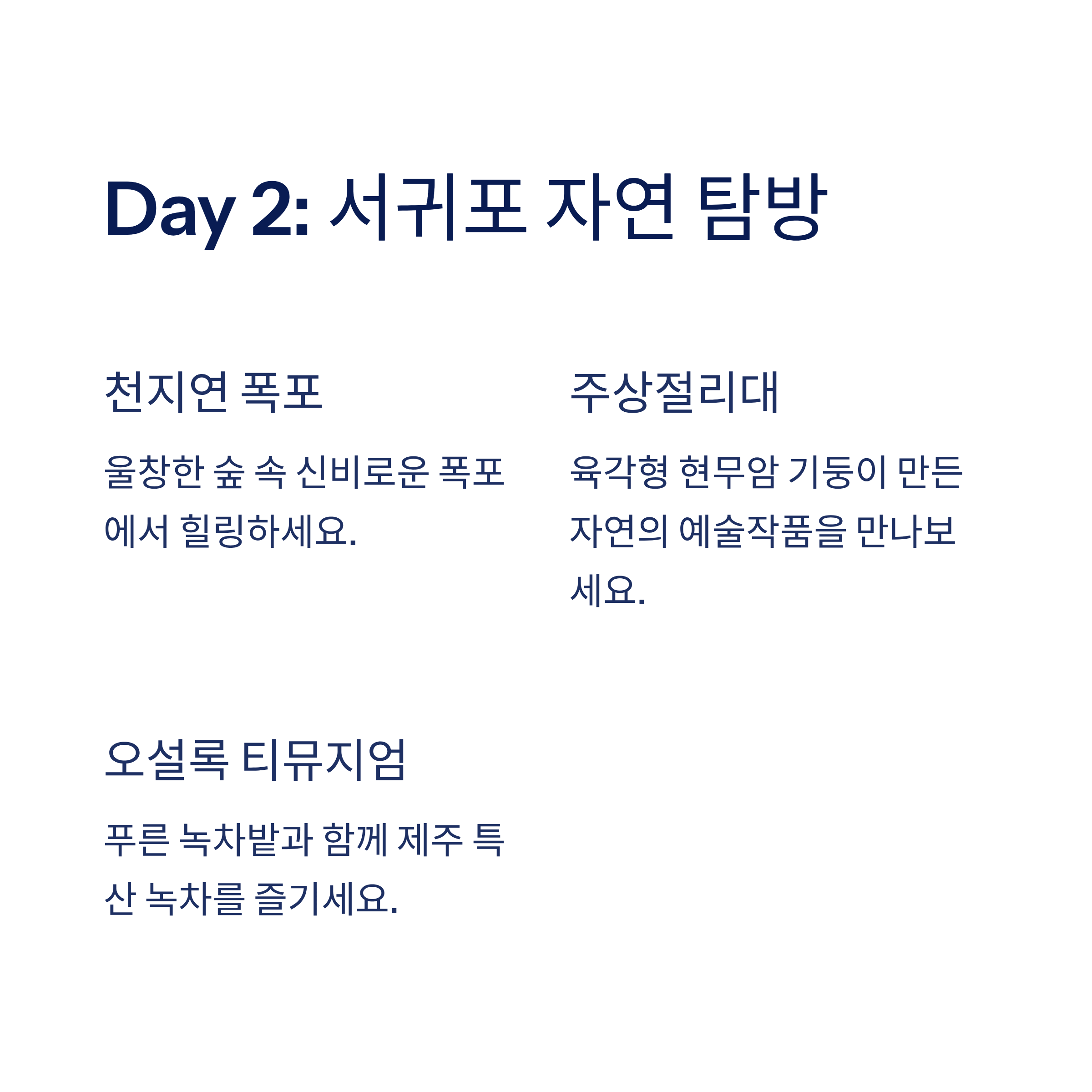 🔽 둘째 날, 서귀포의 자연과 서부의 감성을 만끽해 보세요! 🔽