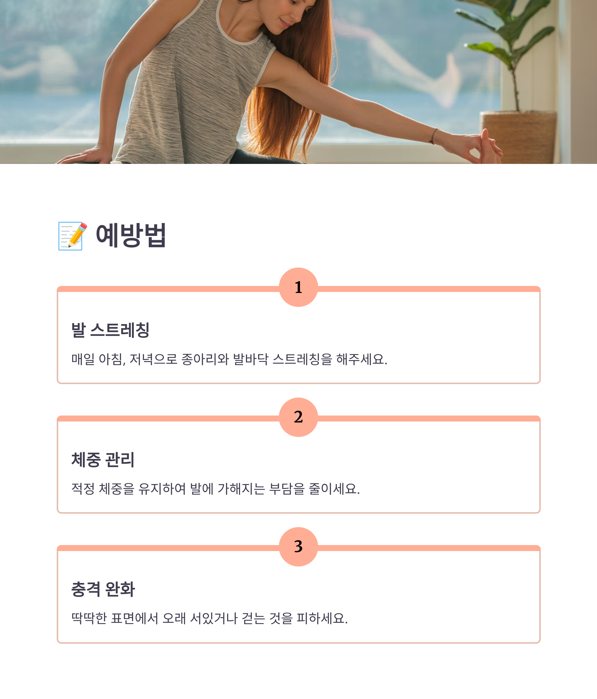 4. 무리한 운동 피하기: 갑자기 운동량을 늘리거나, 발에 과도한 충격을 주는 운동(맨발 달리기, 장시간 점프 등)은 피하세요. 운동 전후에는 반드시 충분한 준비 운동과 마무리 스트레칭을 해주세요.