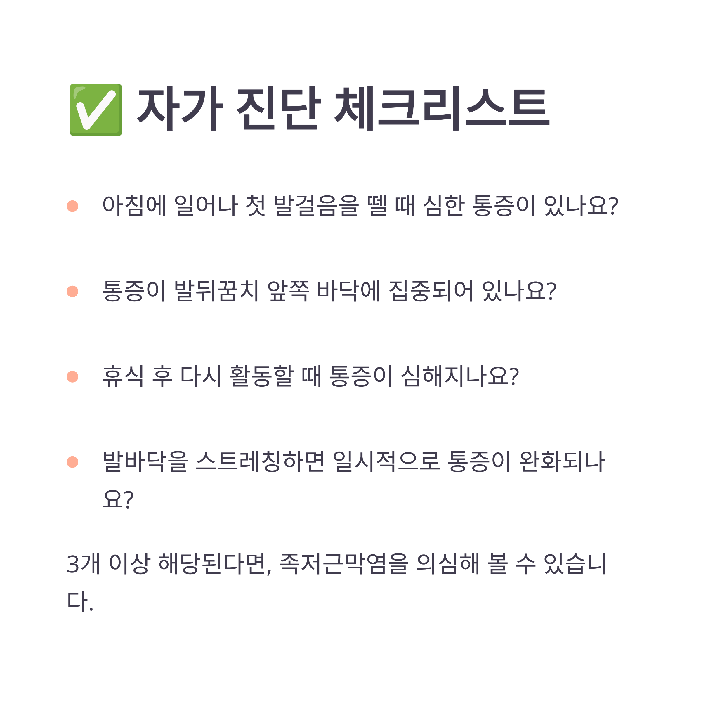 병원에 가기 전, 스스로 족저근막염 증상을 간단하게 확인해 볼 수 있어요. 다음 질문들에 해당되는지 체크해 보세요. 📋