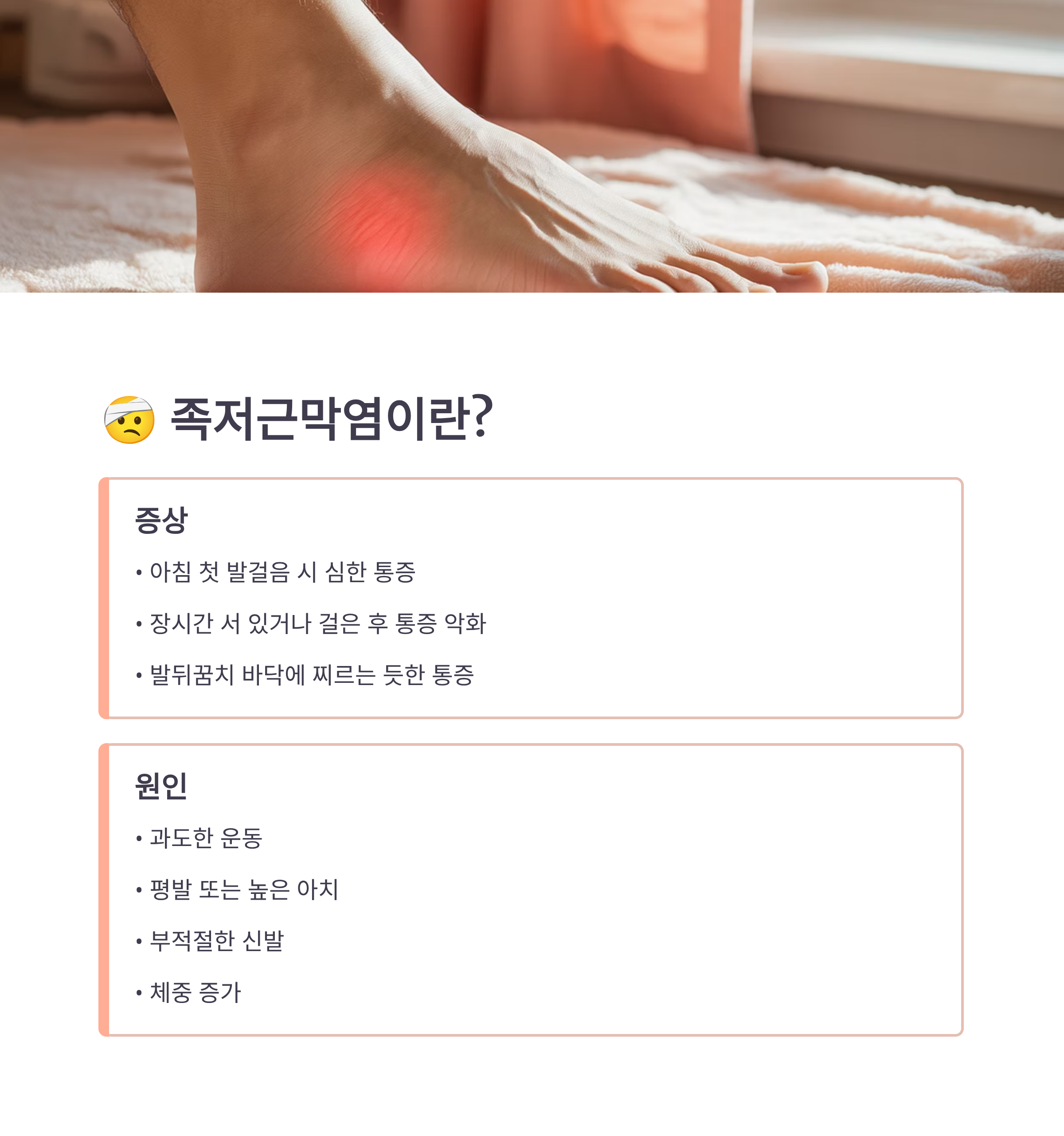 족저근막염은 발바닥에 있는 '족저근막'이라는 섬유띠에 미세한 손상과 염증이 발생하는 질환이에요. 이로 인해 통증이 생기고 일상생활에 불편함을 겪게 됩니다. 🦶