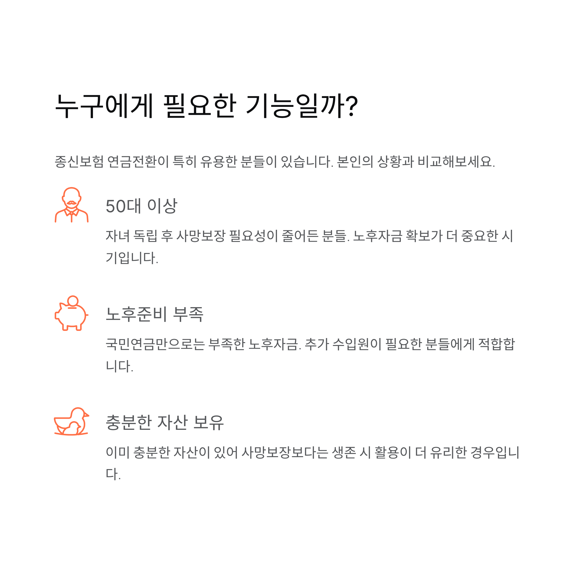 ✅ 자녀들이 모두 성장하여 더 이상 고액의 사망 보장이 필요 없어진 은퇴자