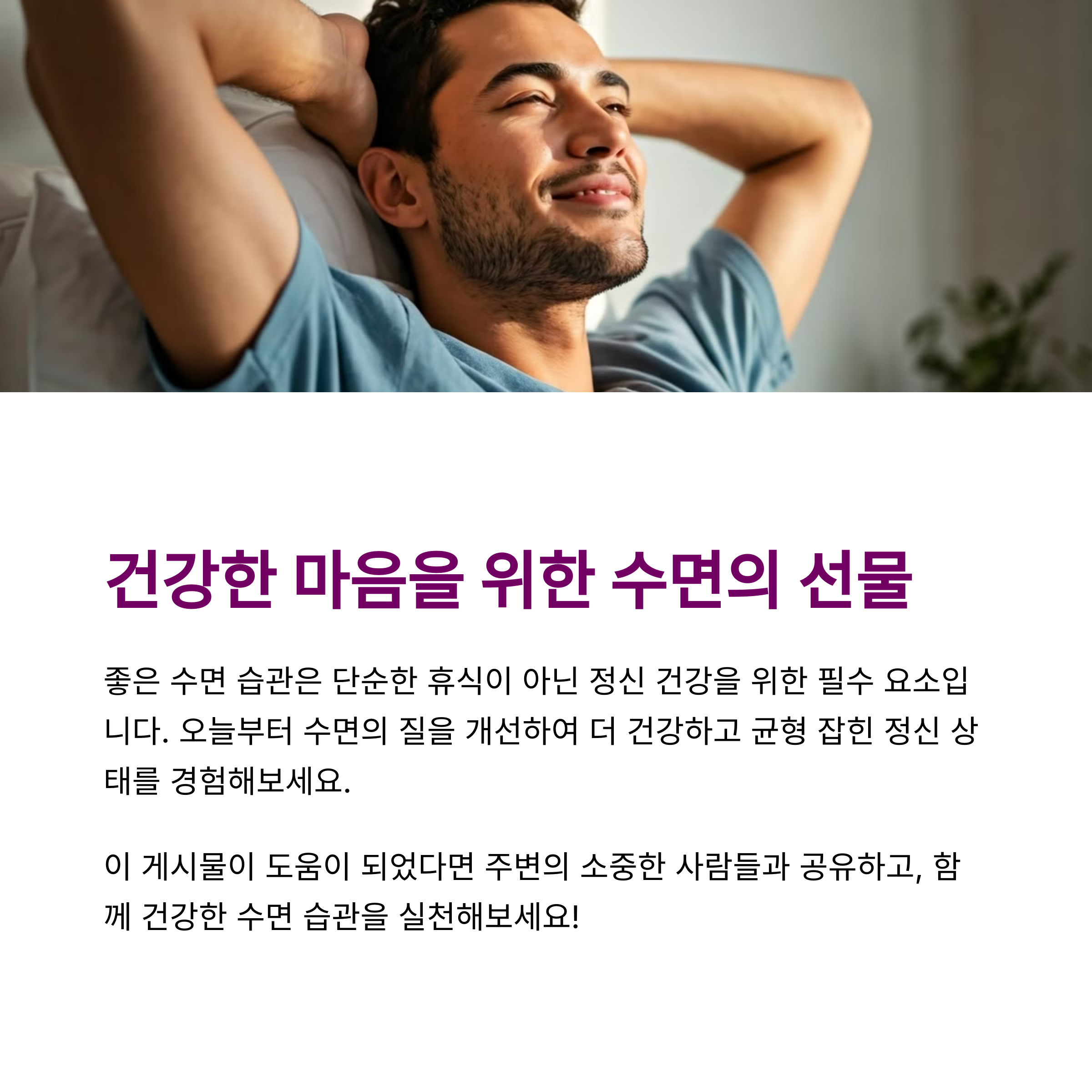 좋은 수면 습관을 유지하는 것은 우리의 정신 건강을 지키는 중요한 첫걸음입니다. 충분하고 규칙적인 수면은 정서적 안정과 심리적 회복에 큰 도움이 됩니다. 여러분도 오늘부터 수면 습관을 점검하고 개선하여 정신 건강을 챙기세요.
