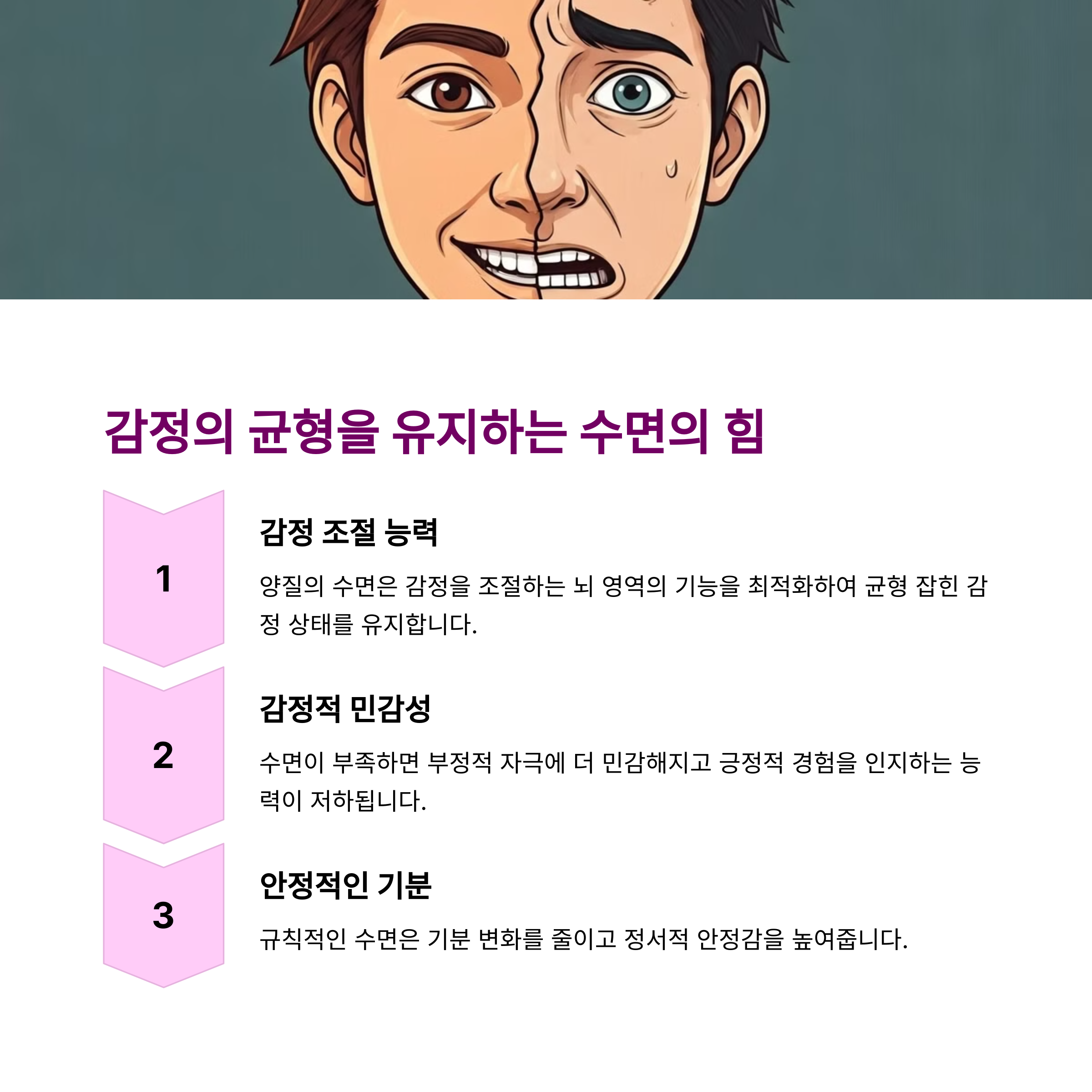 수면의 질은 정신 건강에 깊은 영향을 미칩니다. 불규칙한 수면 패턴이나 과도한 수면은 정신적 불안을 유발할 수 있습니다. 좋은 수면 습관을 유지하는 것은 단순히 피로 회복뿐만 아니라, 정신적 안정을 도모하는 중요한 습관입니다.