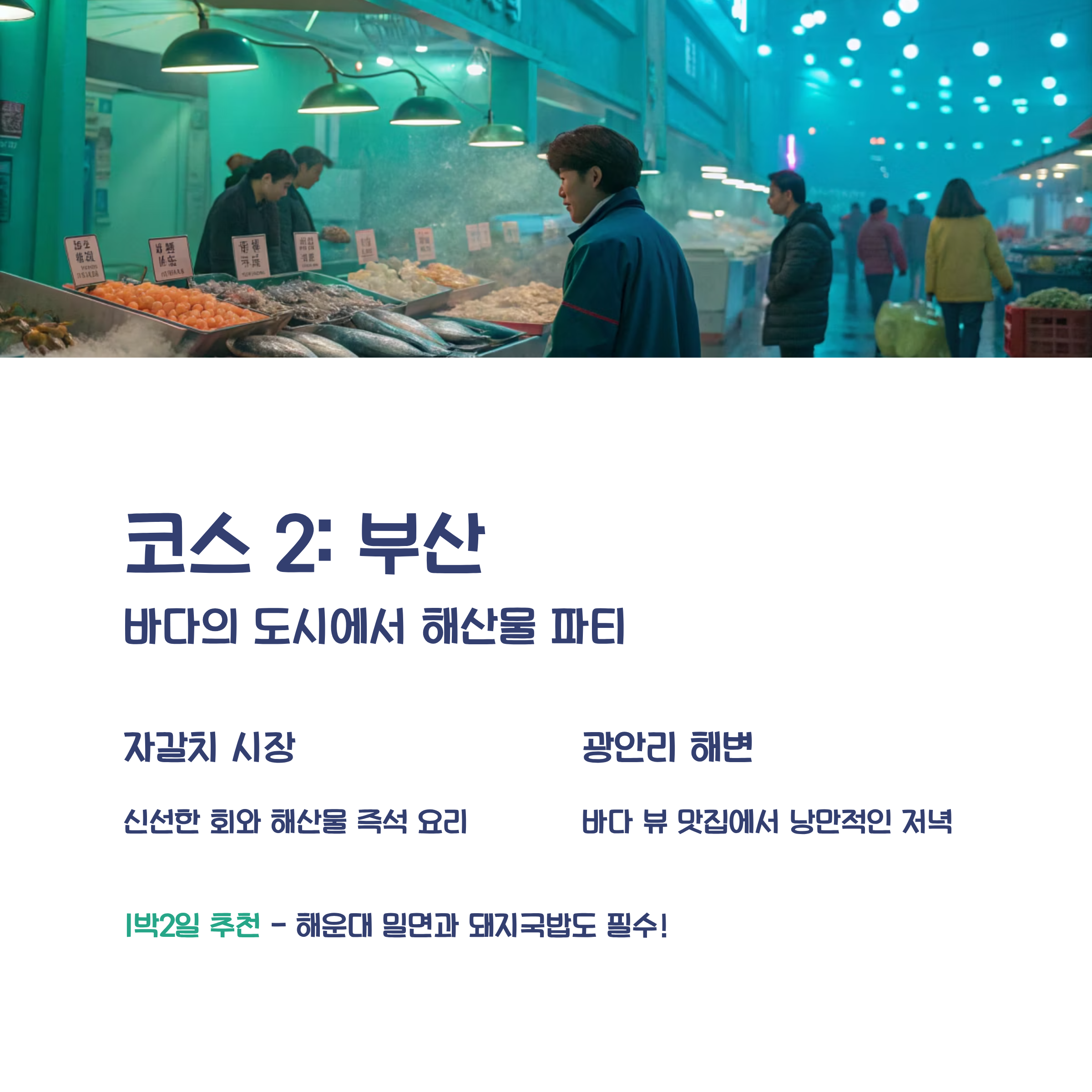 | 코스 2 | 해산물 파티 | 부산 (해운대, 자갈치시장, 남포동) |