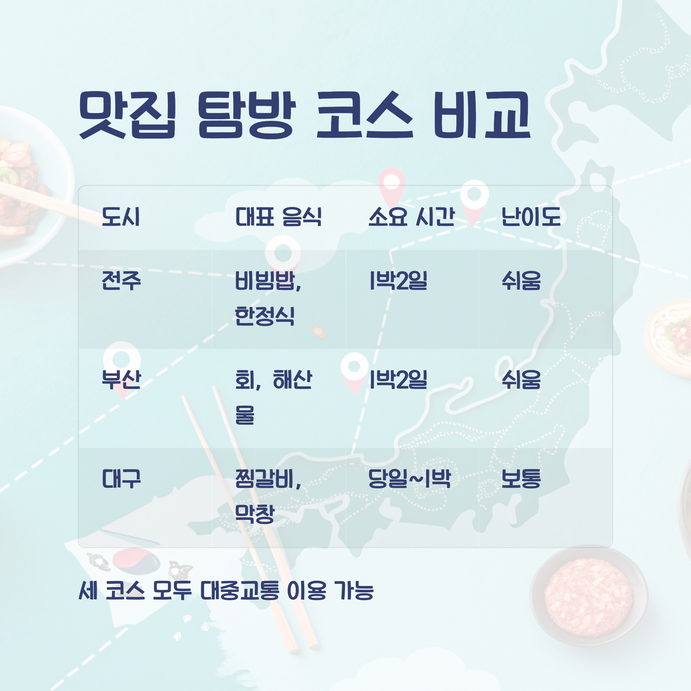 📊 국내 맛집 탐방 코스 핵심 요약표