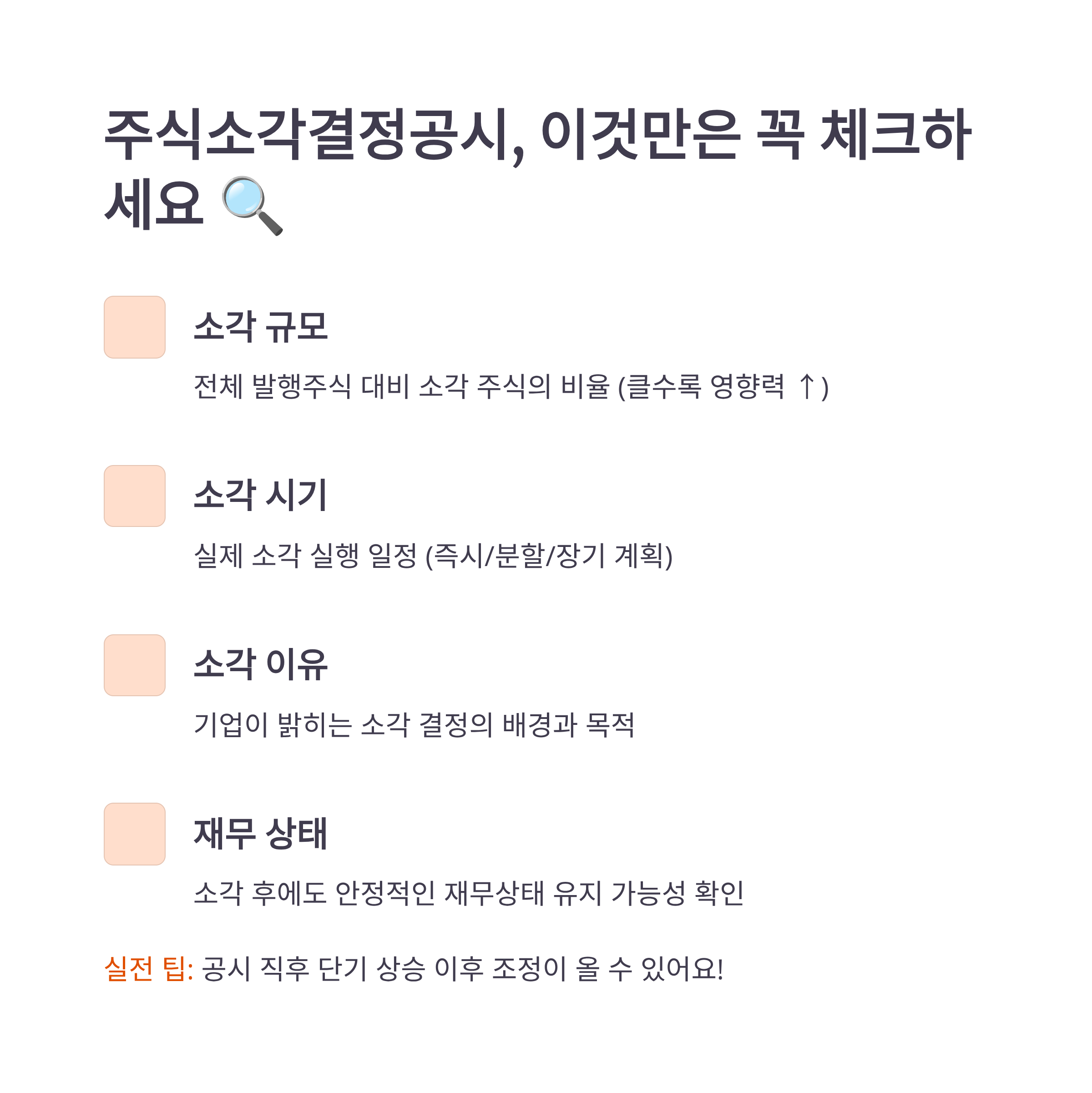 소각 공시 내용 중 '소각 목적'을 면밀히 살펴보세요. 단순한 주가 부양 목적 외에 재무구조 개선이나 결손 보전을 위한 '감자' 방식의 소각이라면, 이는 기업의 재무 상황이 좋지 않다는 신호일 수 있으므로 더욱 신중하게 접근해야 합니다.