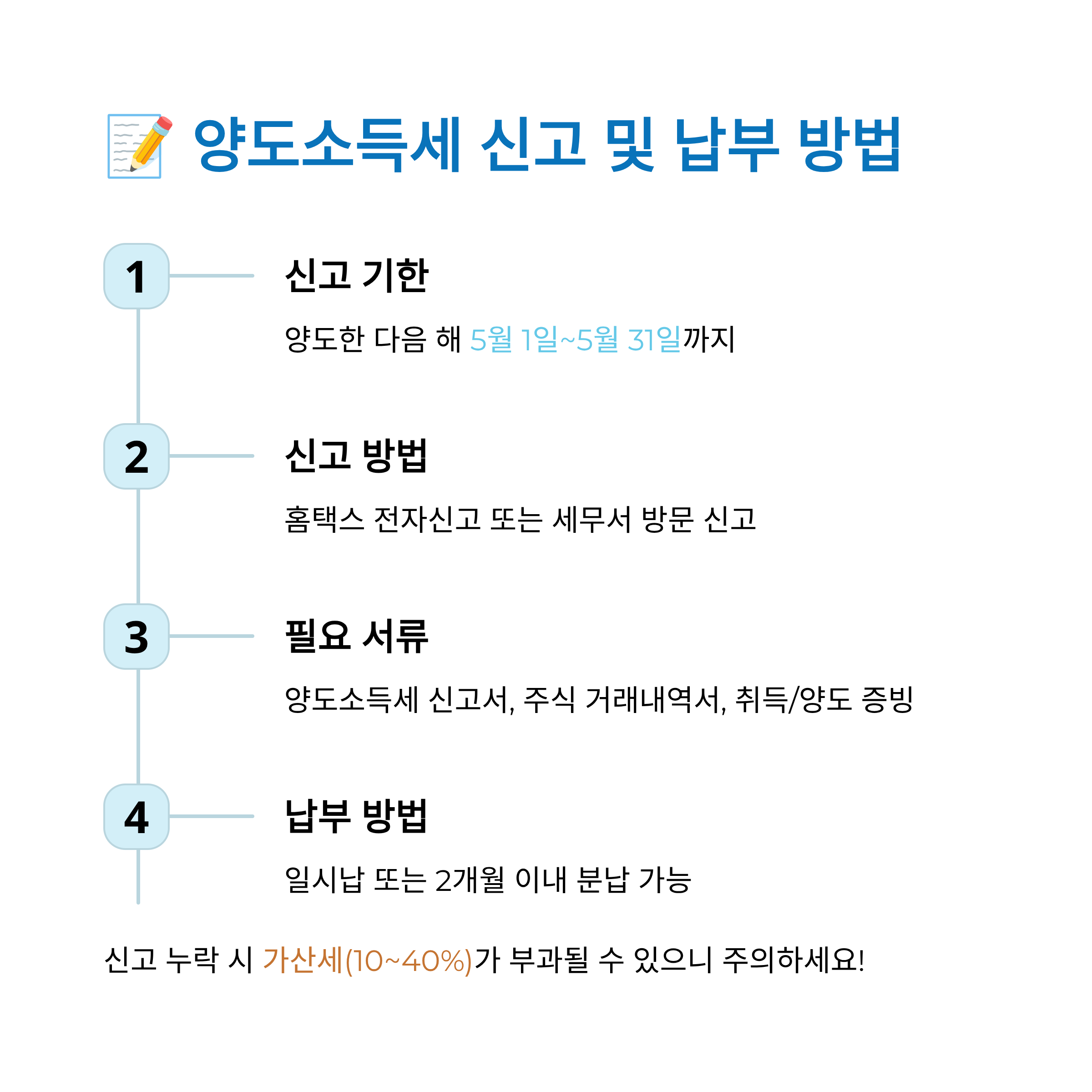 대주주로 분류되어 양도소득세가 발생했다면, 정해진 기간 내에 정확히 신고하고 납부해야 합니다. 📝