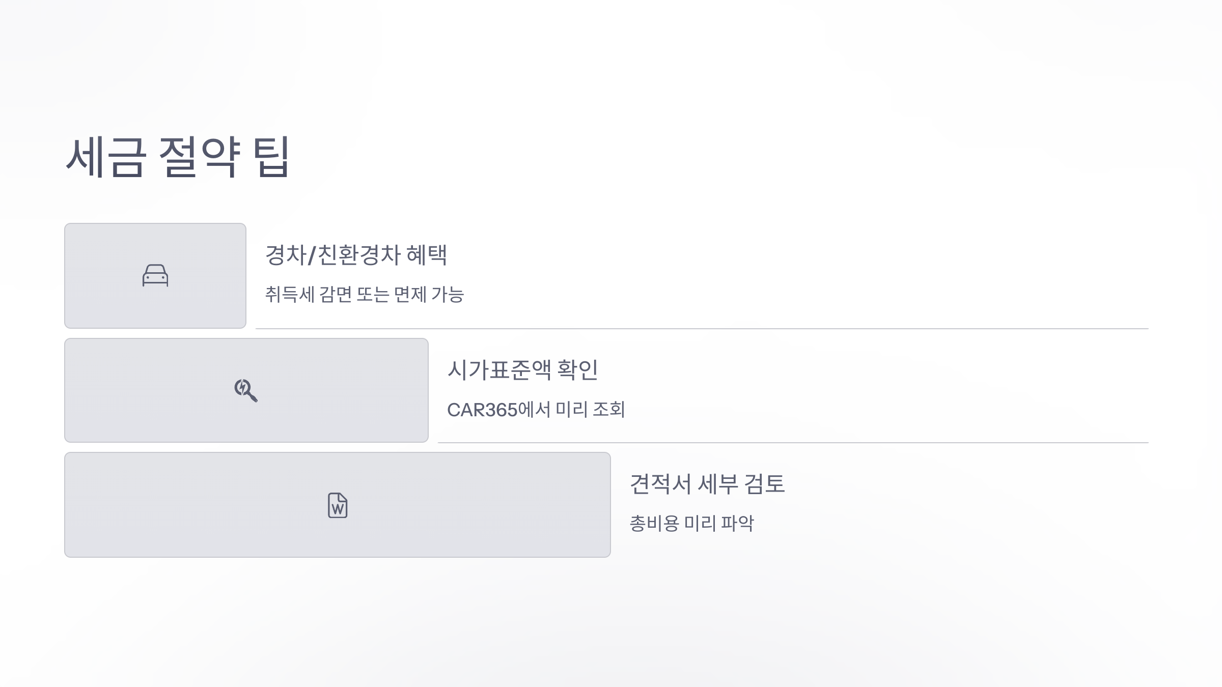 중고차 구매는 신중한 결정이 필요하며, 세금은 그 결정에 중요한 영향을 미치는 요소입니다. 아래 체크리스트를 통해 성공적인 중고차 구매를 준비해 보세요.