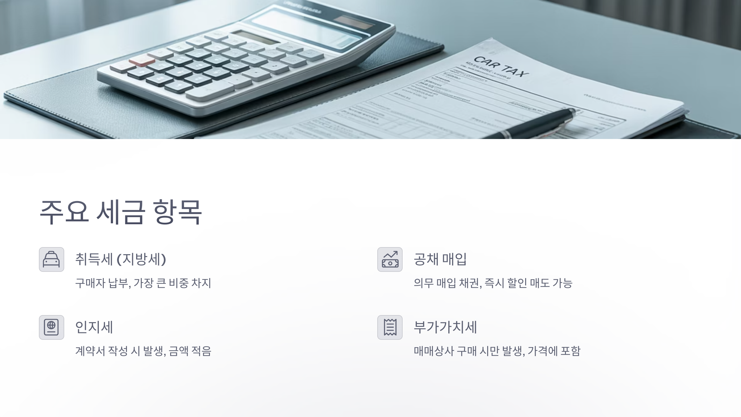 중고차를 구매할 때 주로 고려해야 할 세금은 크게 취득세, 공채 매입 비용, 인지세, (경우에 따라) 부가가치세 등이 있습니다. 각 세금의 특징과 납부 주체를 명확히 아는 것이 중요합니다.