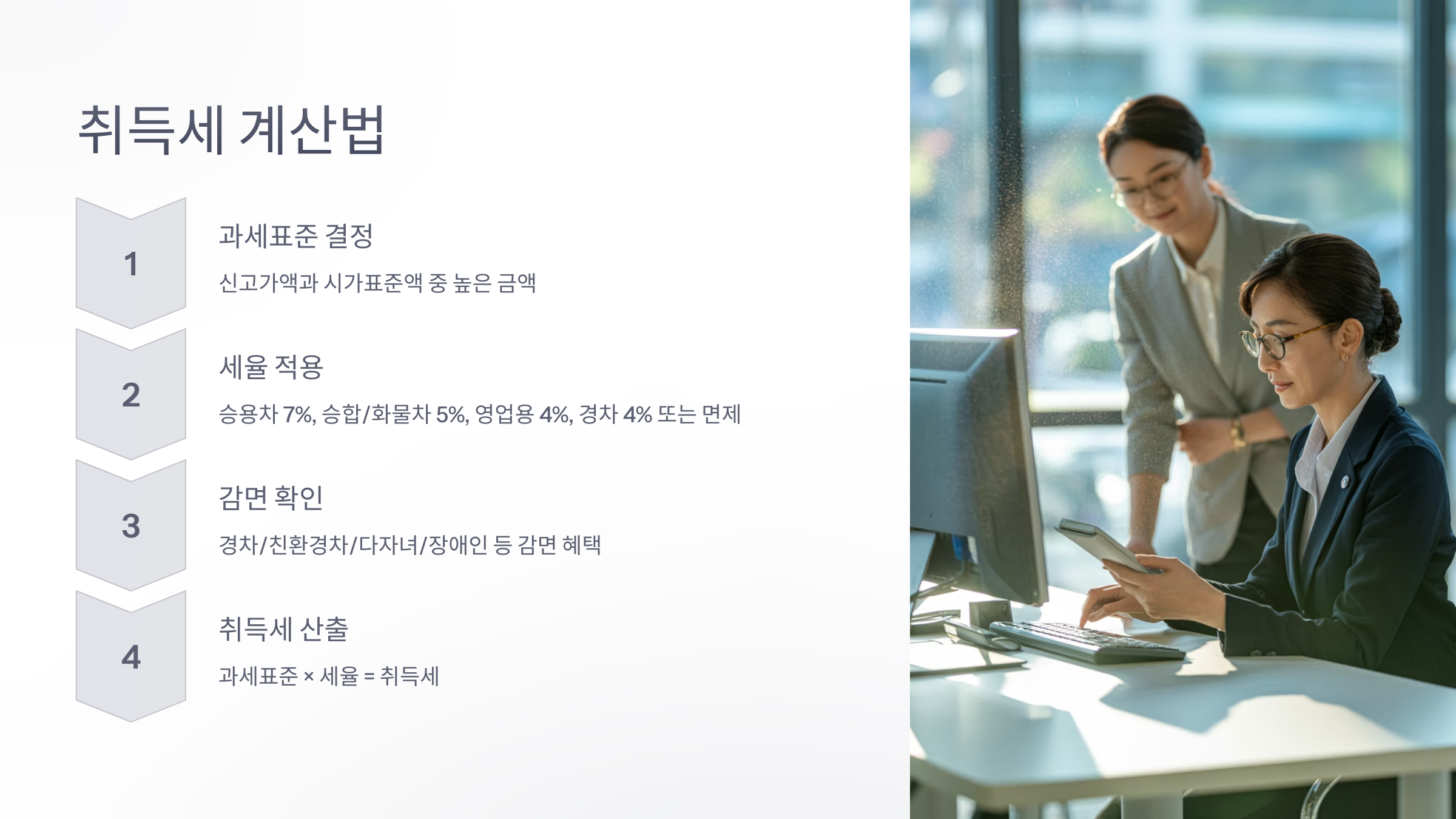 - 비영업용 승용자동차: 7% (경차는 4% 또는 면제/감면 혜택)