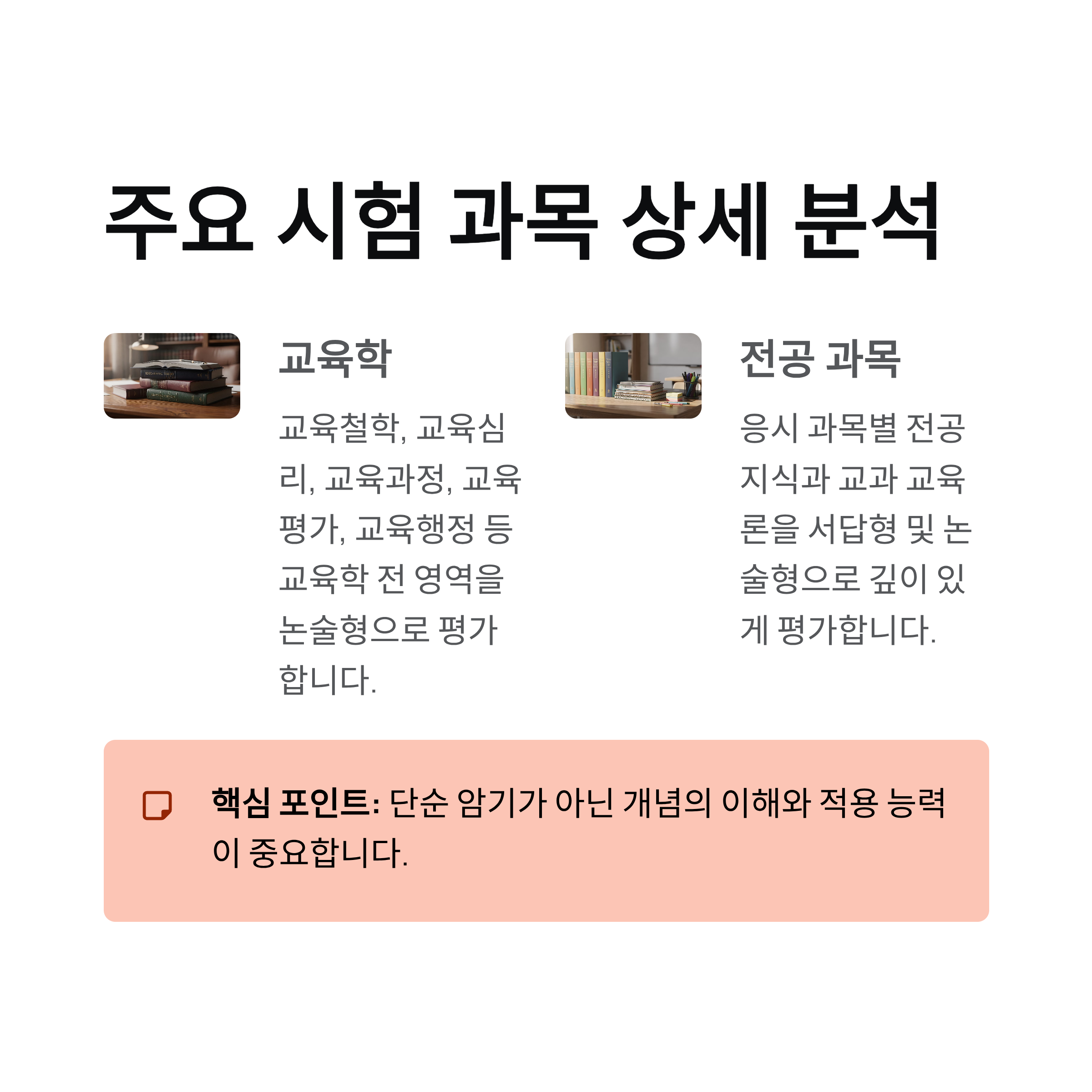 - 전공 (Major): 각 교과별 심화 지식을 다룹니다. 전공 내용 학(지식)과 전공 교육학(지도법)이 함께 출제되며, 가장 배점이 높고 공부량도 많습니다.