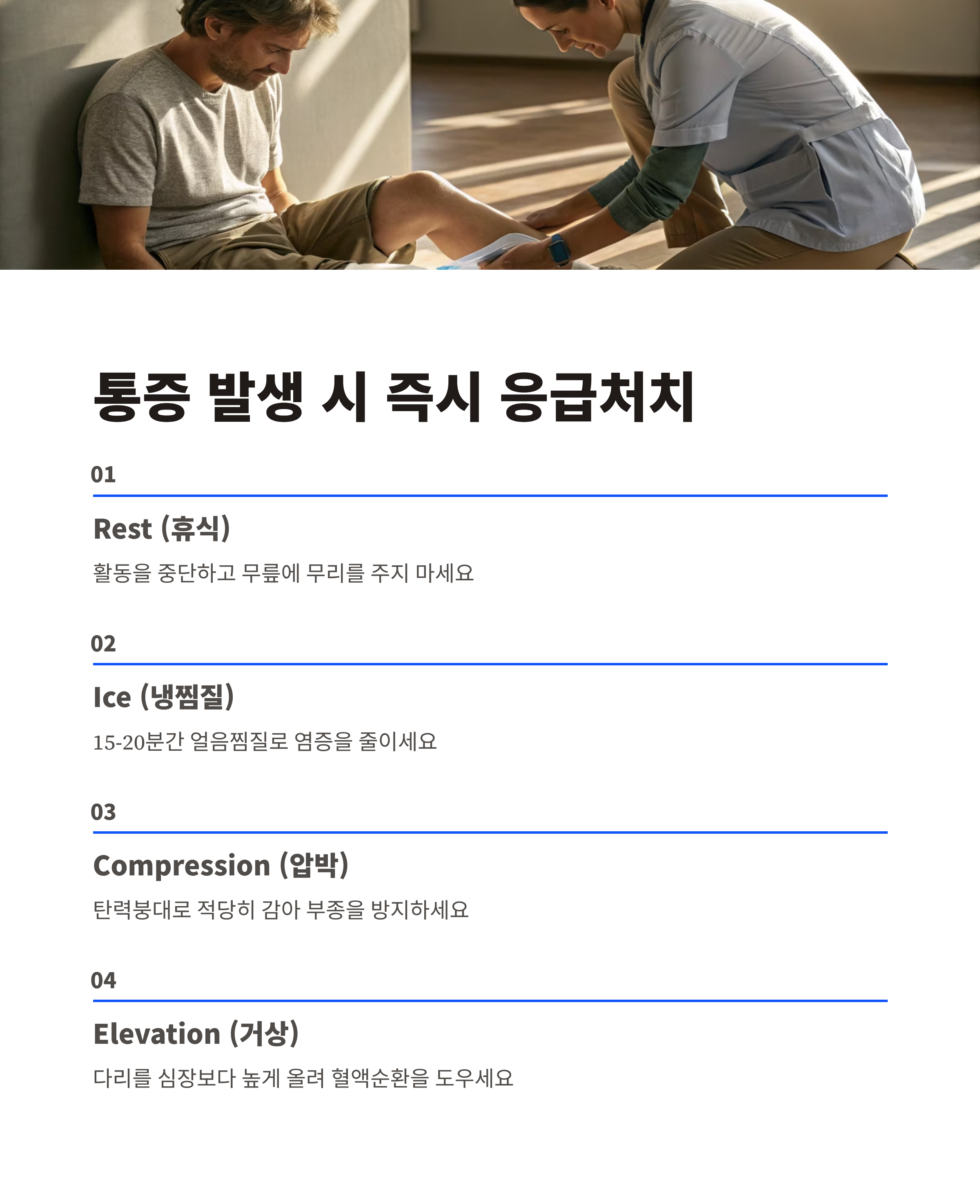 통증 발생 시 즉시 해야 할 응급처치 (RICE) 🚑
