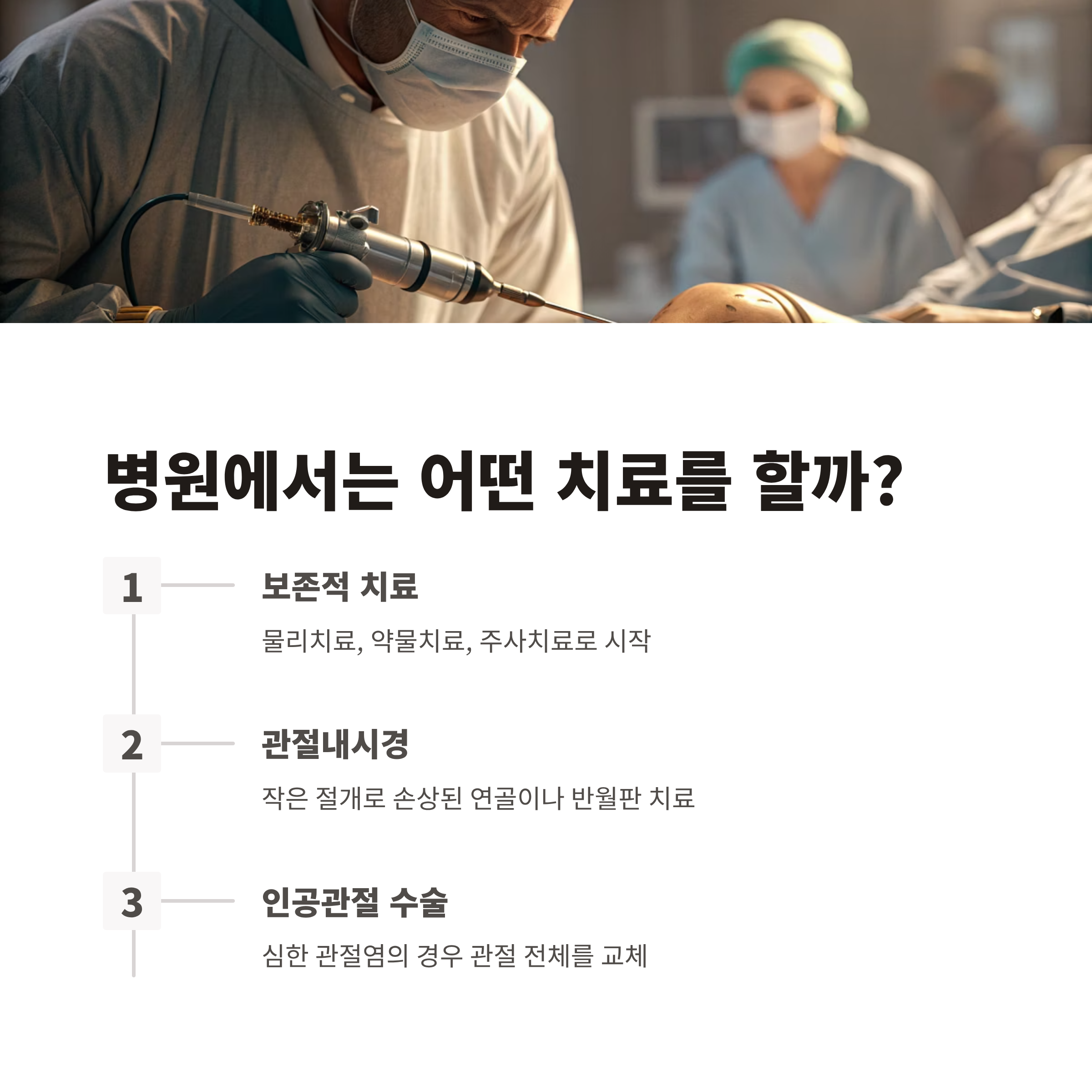- 인공관절 치환술: 연골이 모두 닳아 없어진 말기 관절염 환자에게 시행하는 최후의 수술입니다.