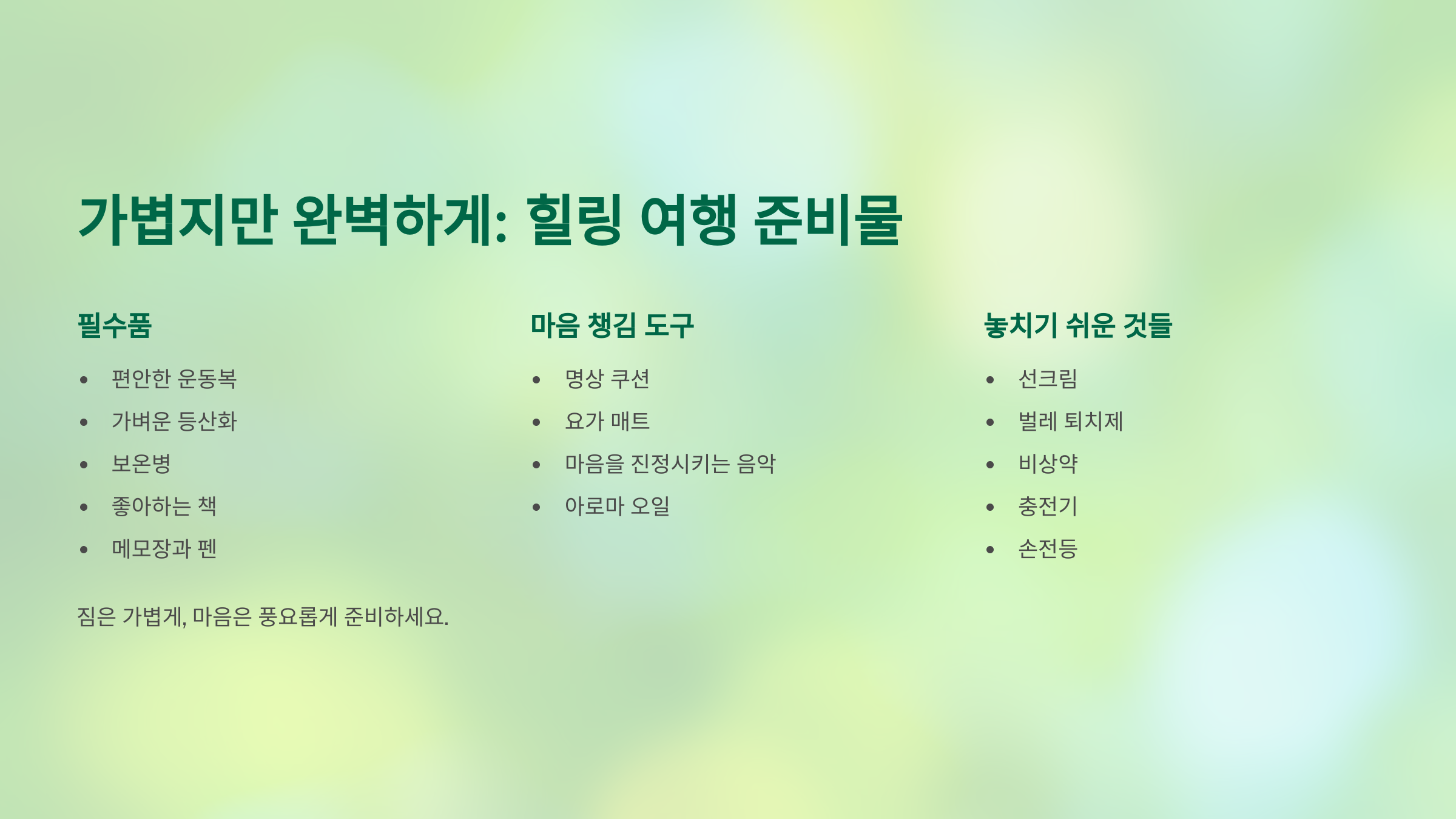 👇 완벽한 힐링 여행을 위한 필수 준비물 리스트를 살펴봅니다.