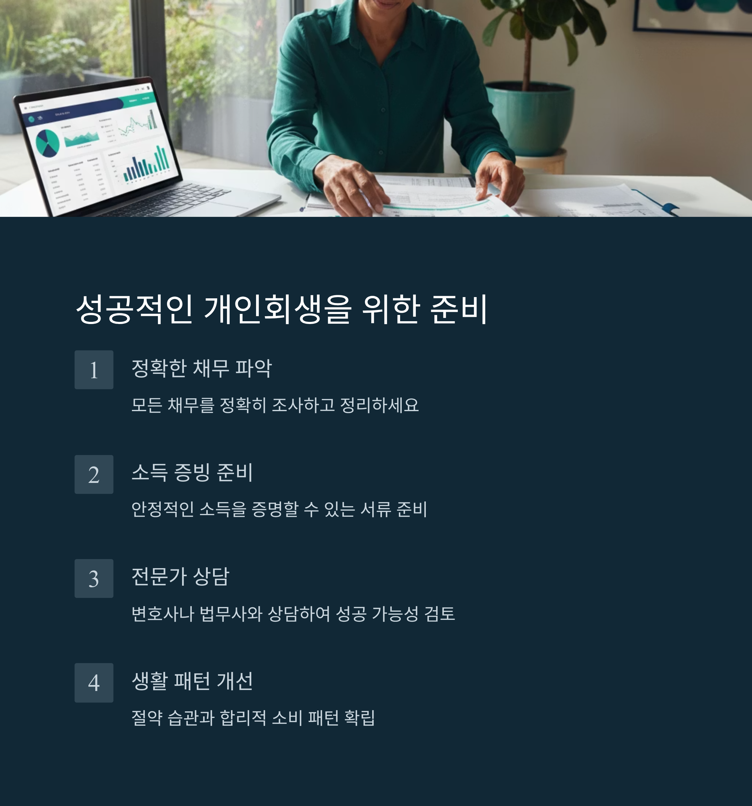 - 현실적인 변제계획 수립: 자신의 소득에서 최저생계비 등을 제외한 가용 소득으로 3~5년간 꾸준히 갚을 수 있는 현실적인 변제계획안을 작성해야 합니다. 무리한 계획은 중도 실패로 이어질 수 있습니다.