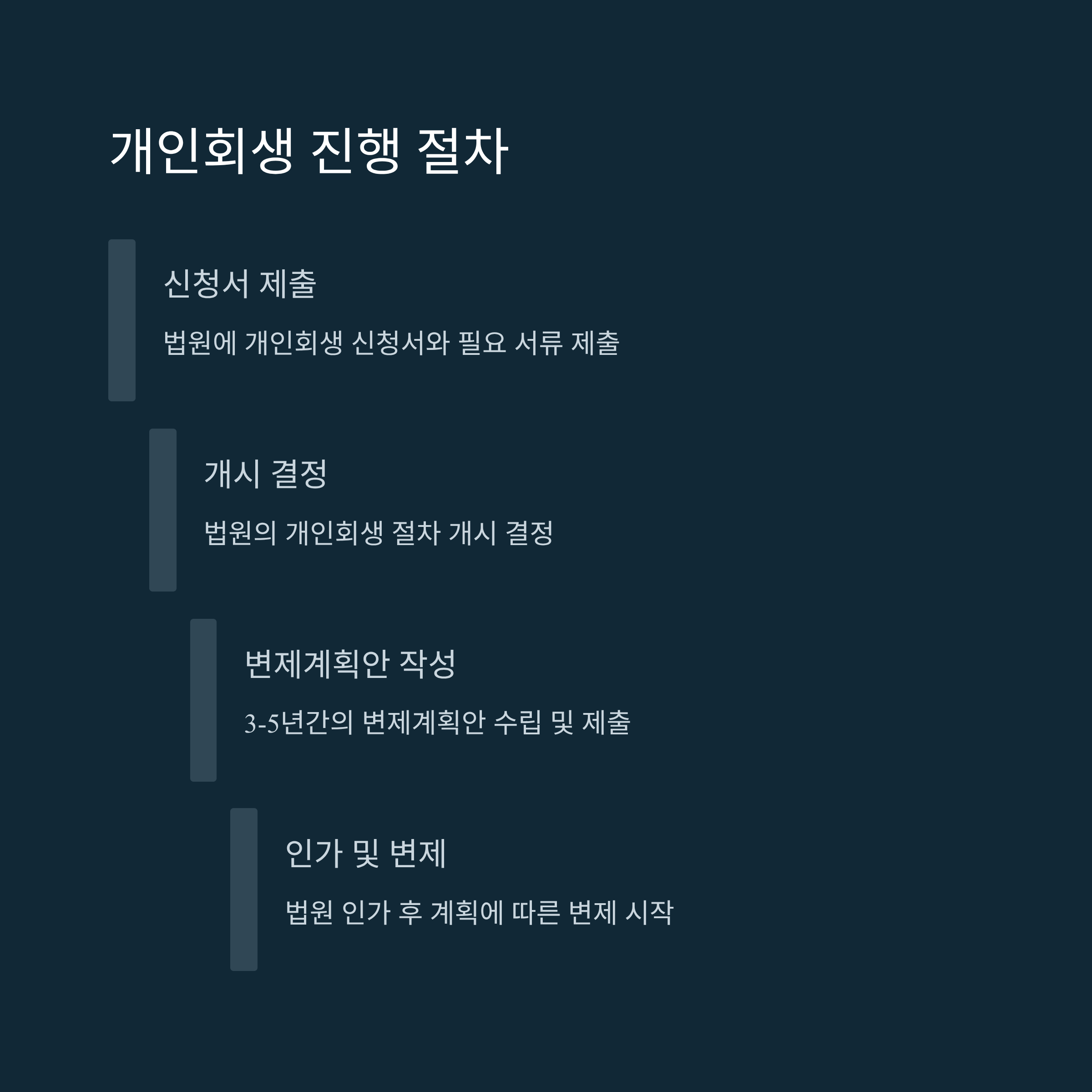 개인회생 절차는 법원에 신청서를 제출하는 것부터 면책 결정을 받기까지 여러 단계를 거치게 됩니다.