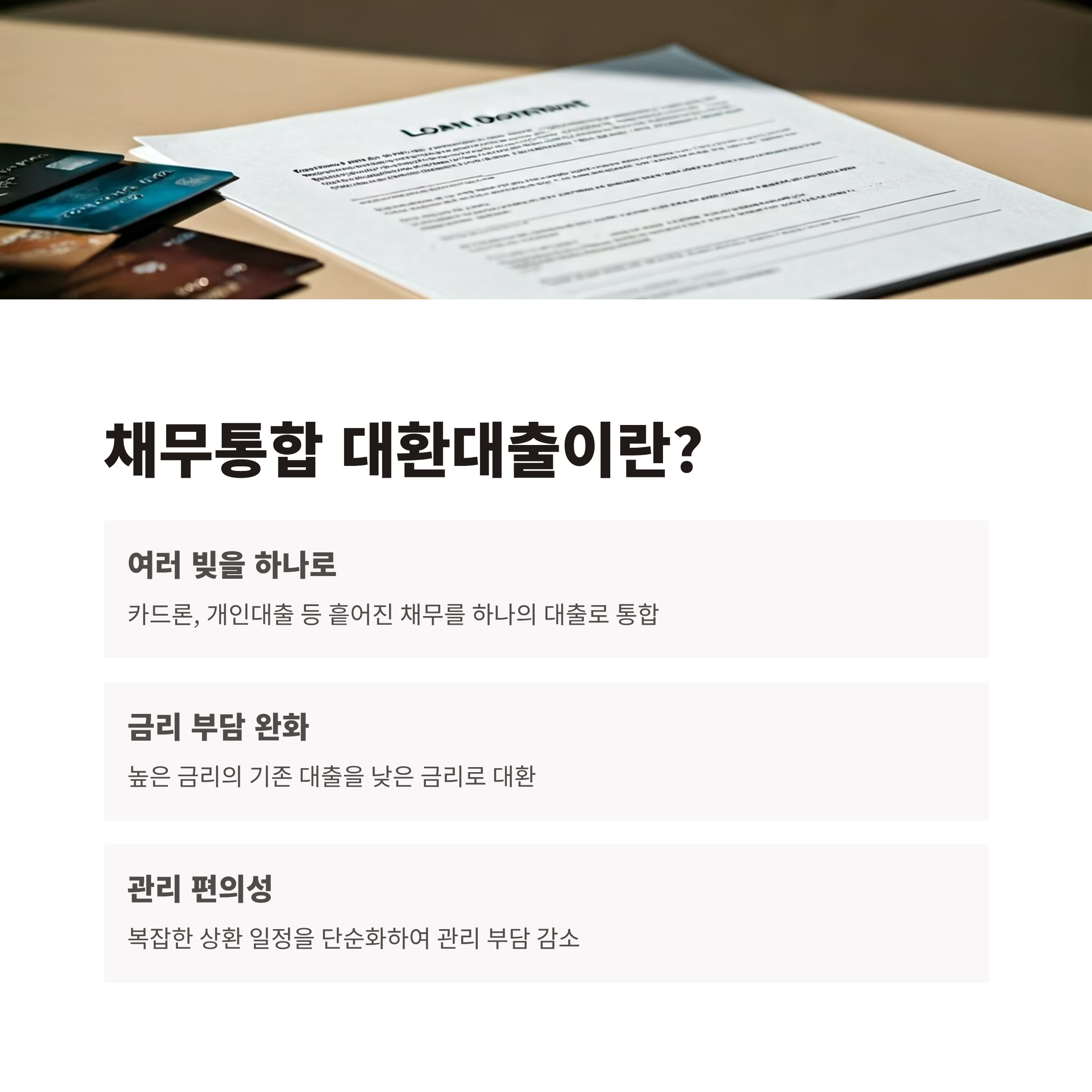 채무통합 대환대출은 여러 금융기관에 흩어져 있는 대출(신용대출, 카드론, 현금서비스, 저축은행 대출 등)을 하나로 묶어, 더 낮은 금리로 새로운 대출을 받아 기존의 여러 대출을 한 번에 갚는 금융 상품입니다. 한마디로 '빚 갈아타기'라고 생각하면 쉽습니다.