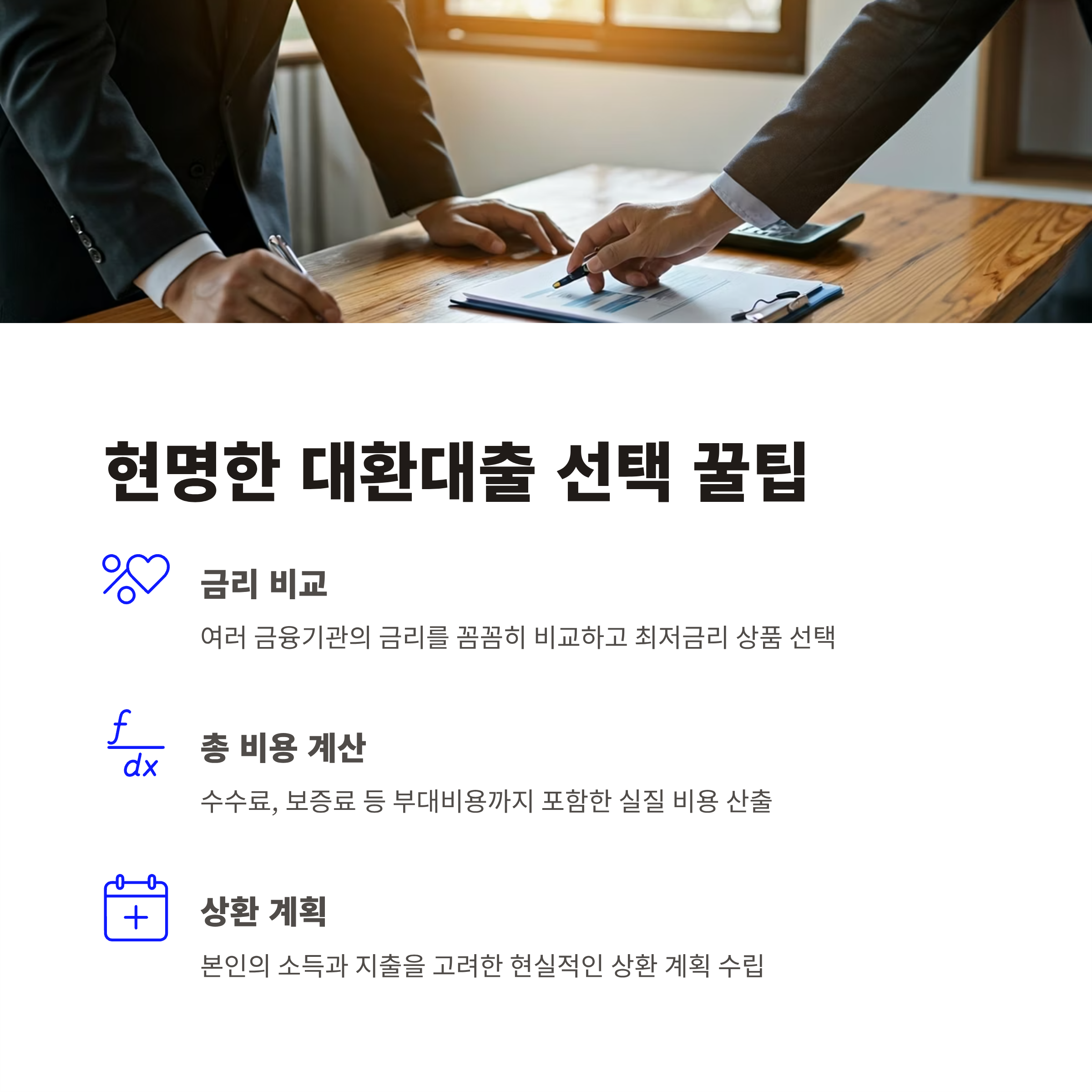 - 중도상환수수료: 기존 대출을 중도에 상환할 때 발생하는 수수료를 고려해야 합니다. 대환대출로 얻는 이자 절감액이 중도상환수수료보다 커야 이득입니다.
