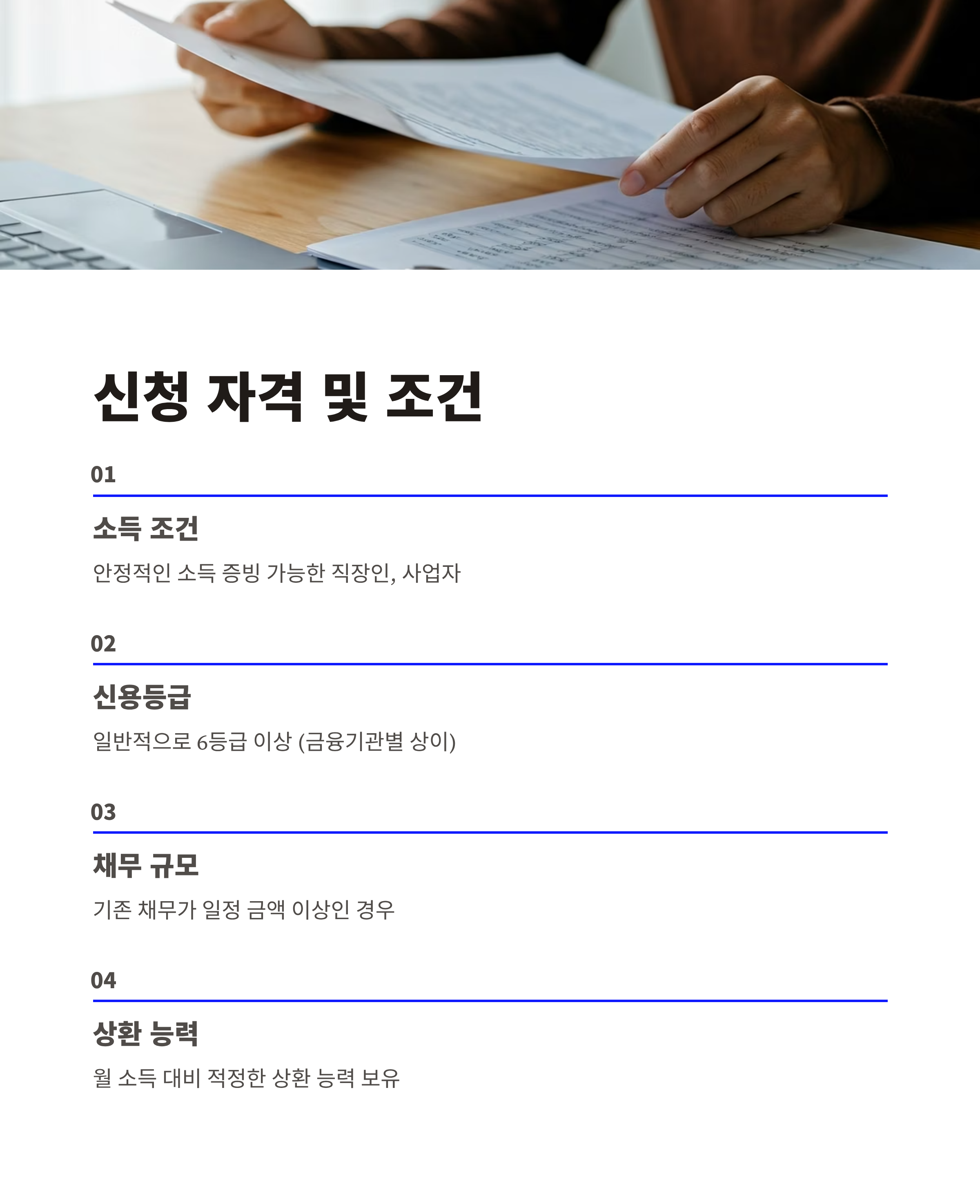 채무통합 대환대출은 아무나 신청할 수 있는 것이 아닙니다. 금융기관마다 자격 조건이 다르지만, 일반적으로 다음과 같은 기준을 요구합니다.