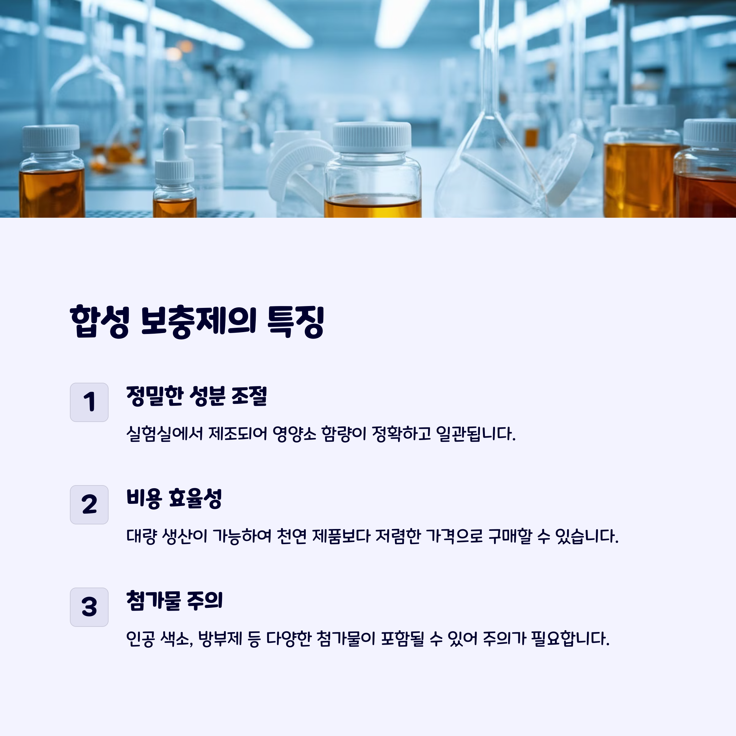 반면, 합성 보충제는 **생산 과정에서 정확한 영양소 함량을 조절**할 수 있으며, 비교적 **저렴한 가격**으로 제공됩니다. 그러나 인공 첨가물이 포함될 수 있으며, 장기적인 안전성에 대한 논란이 있을 수 있습니다. 특히 일부 합성 비타민은 체내에서 과다 축적될 위험이 있어 섭취량을 조절하는 것이 중요합니다.